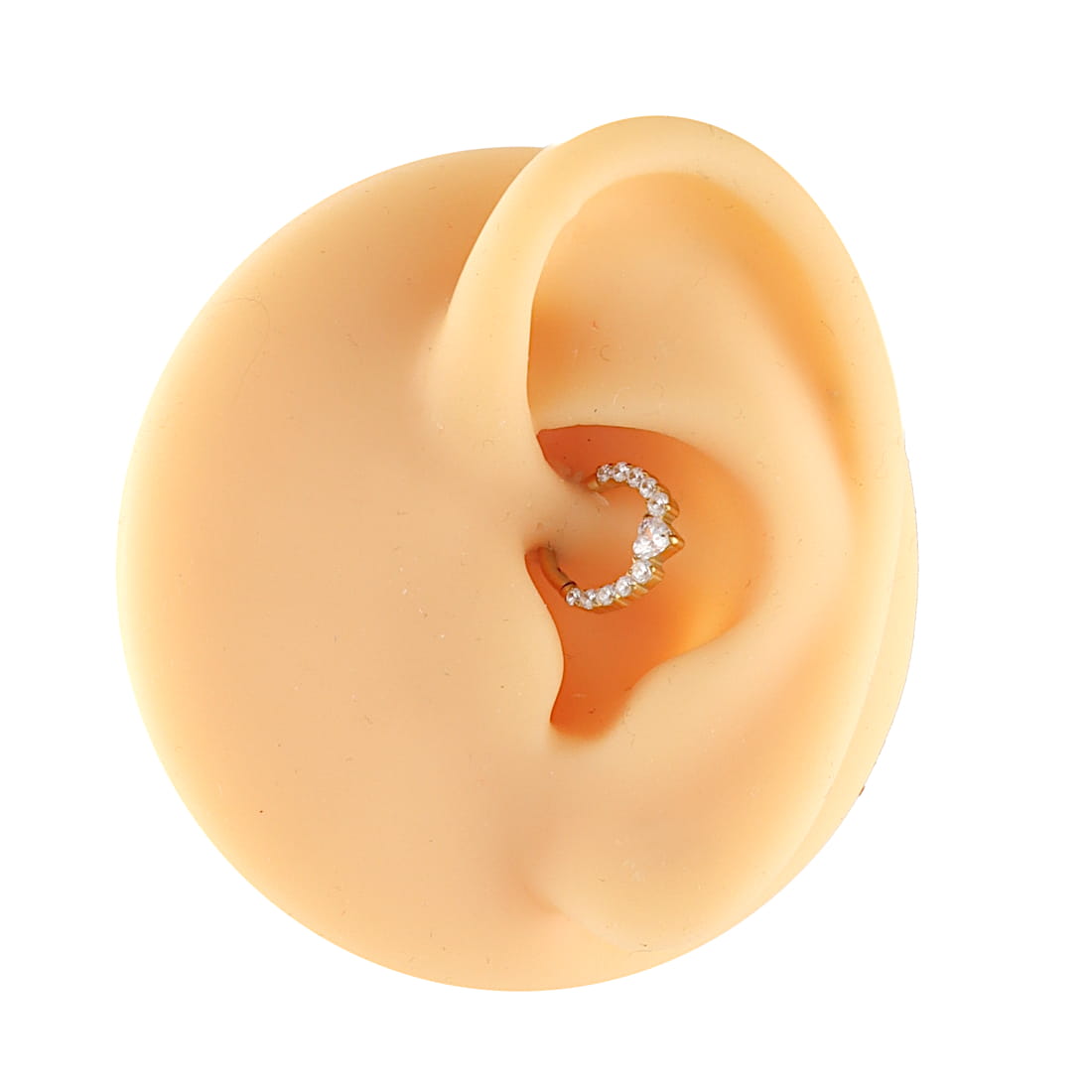 Kolczyk typu clicker wykonany z wysokiej jakości tytanu G23, który jest materiałem hipoalergicznym, bezpiecznym dla osób z wrażliwą skórą oraz przyspieszającym proces gojenia. Powierzchnia biżuterii została pokryta trwałą powłoką PVD w kolorze złotym. Metoda ta polega na próżniowym nanoszeniu koloru, co gwarantuje wyjątkową odporność na ścieranie, przebarwienia oraz czynniki zewnętrzne, pozwalając zachować estetyczny wygląd przez długi czas użytkowania.