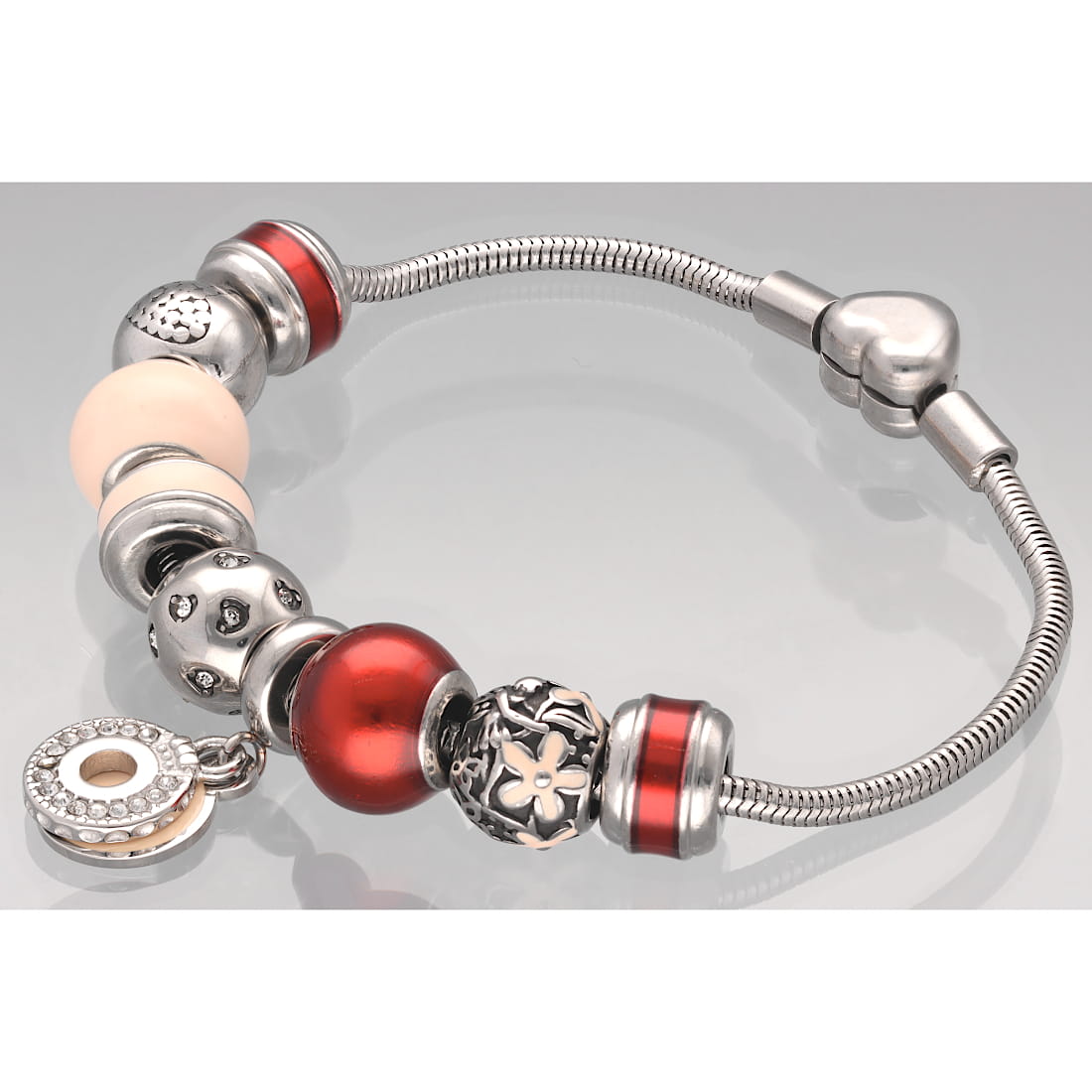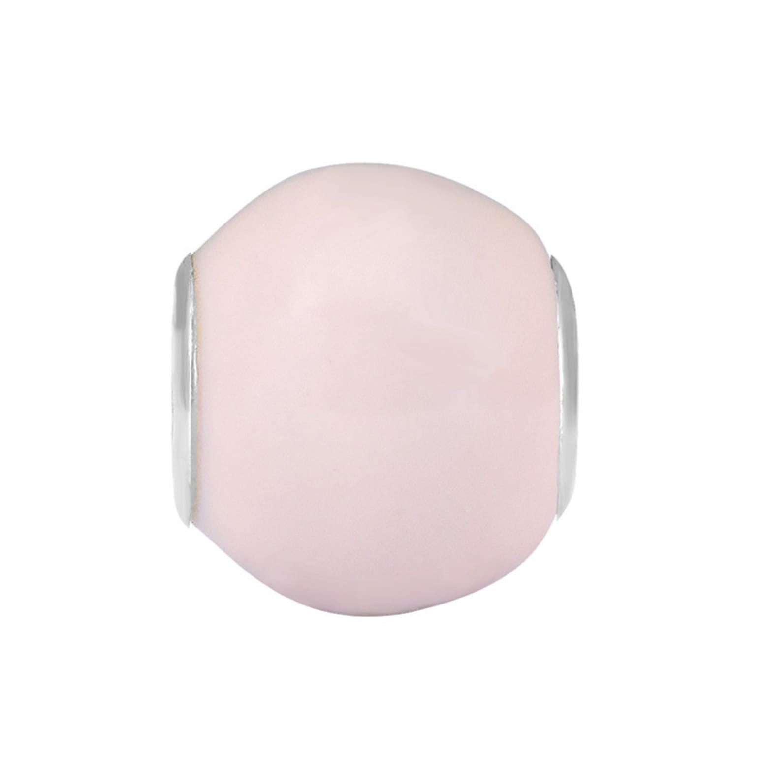 Klasyczny kulisty koralik modułowy typu charms, wykonany z emaliowanej stali szlachetnej. Wyróżnia się prostotą formy i pastelowym różowym kolorem.
