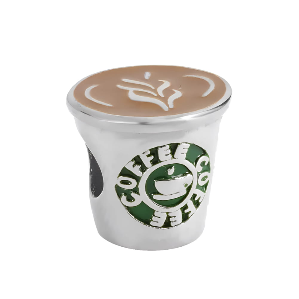 Uroczy koralik modułowy typu charms w kształcie kubka kawy, wykonany z emaliowanej stali szlachetnej. Korpus koralika ma kształt klasycznego kubka na wynos. Górna część koralika imituje powierzchnię kawy z pianką latte art, gdzie widoczne są artystycznie ułożone białe linie na beżowym tle, sugerujące wzór, jaki często tworzy się na kawie. Po bokach kubka znajduje się wyraźny, zielony okrąg z napisem "COFFEE" w białych, wypukłych literach, a w jego środku umieszczony jest biały symbol filiżanki z parującym napojem. Detale te są starannie wykonane i wypełnione emalią, co nadaje koralikowi wyrazisty, trójwymiarowy wygląd.