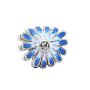 Kwiat, przypominający stokrotkę, ma liczne, gęsto ułożone płatki. Ich powierzchnia jest z jednej strony pokryta cieniowaną biało-niebieską emalią, co daje efekt ręcznie malowanego wzoru. Krawędzie płatków są wyraźnie zarysowane, w kolorze srebrnym, co podkreśla ich kształt i dodaje koralikowi trójwymiarowości. Tył koralika nie jest emaliowany.