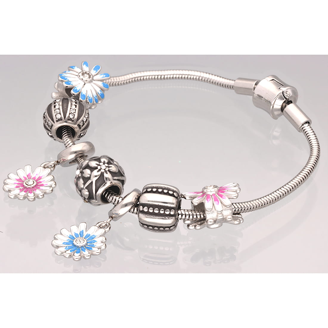 Uroczy koralik modułowy typu charms w kształcie delikatnego kwiatu wykonany z emaliowanej stali szlachetnej.