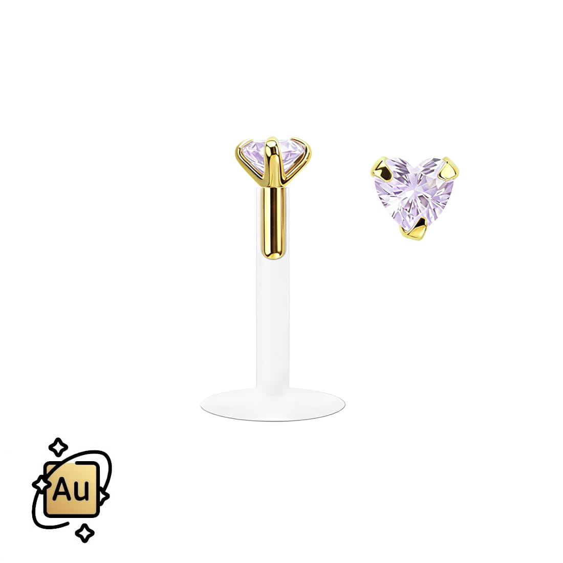 Subtelny labret push-in z lawendową cyrkonią w kształcie serduszka z bezgwintową szpilką z 10-karatowego złota (Au 417*). Sztanga wykonana z wysokiej jakości półprzezroczystego materiału Bioflex jest lekka i hipoalergiczna.