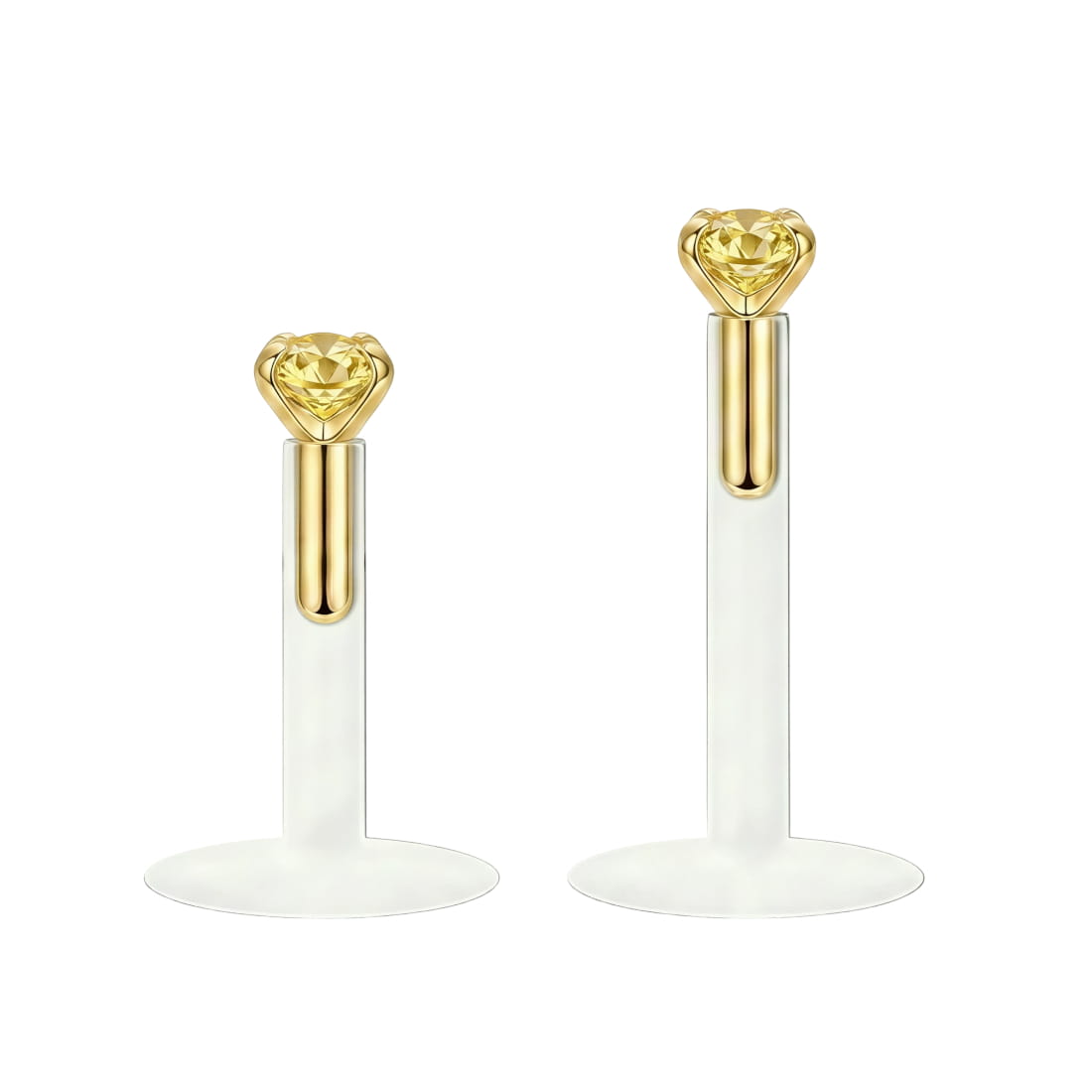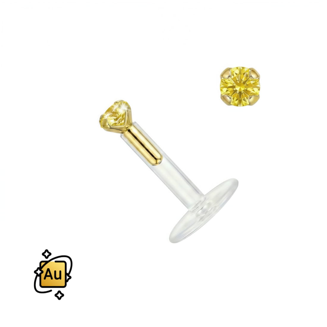 Subtelny labret push-in z bezgwintową szpilką z 10-karatowego złota (Au 417*), na której końcu zakuta jest okrągła, żółta cyrkonia. Sztanga wykonana z wysokiej jakości półprzezroczystego materiału Bioflex jest lekka i hipoalergiczna.