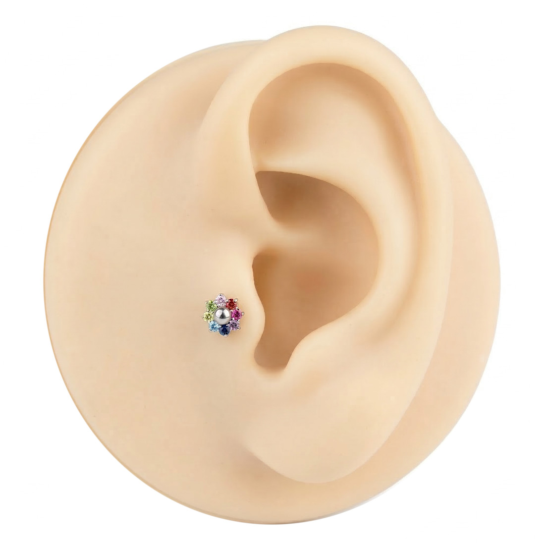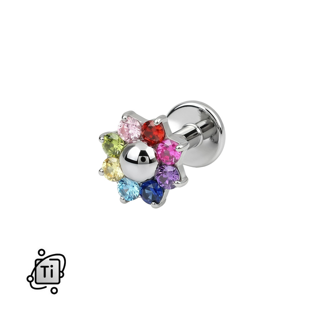 Labret tytanowy KWIATUSZEK z kolorowych cyrkonii - srebrny