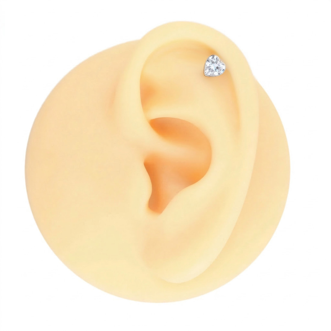 Konstrukcja kolczyka opiera się na prostej sztandze zakończonej płaskim dyskiem, który minimalizuje ryzyko podrażnień wewnątrz jamy ustnej lub za uchem. Część ozdobna ma formę oszlifowanej przeźroczystej cyrkonii w kształcie serca, osadzonego stabilnie w metalowej oprawie.