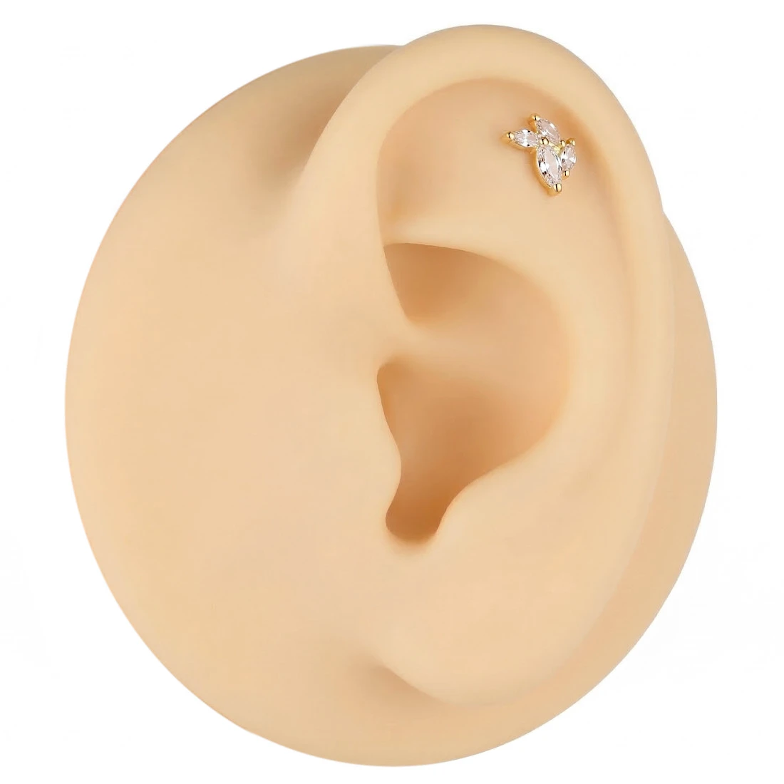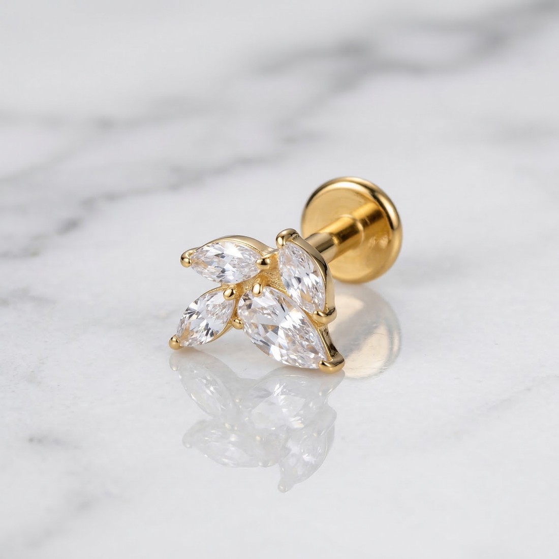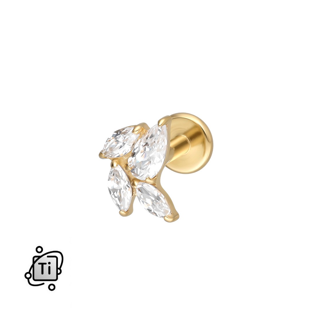 Tytanowy labret z czterema kryształkami w kształcie markizy wykonany z wysokiej jakości Tytanu G23, który jest materiałem wyjątkowo lekkim, a jednocześnie bardzo trwałym i odpornym na uszkodzenia mechaniczne. Powierzchnia metalu została pokryta złotą powłoką PVD. Metoda ta polega na osadzaniu warstwy koloru w fazie próżniowej, co gwarantuje znacznie większą trwałość i odporność na ścieranie niż tradycyjne złocenie. Tytan jest metalem biokompatybilnym, dzięki czemu kolczyk jest bezpieczny dla osób o wrażliwej skórze i może być stosowany w świeżych oraz zagojonych przekłuciach.