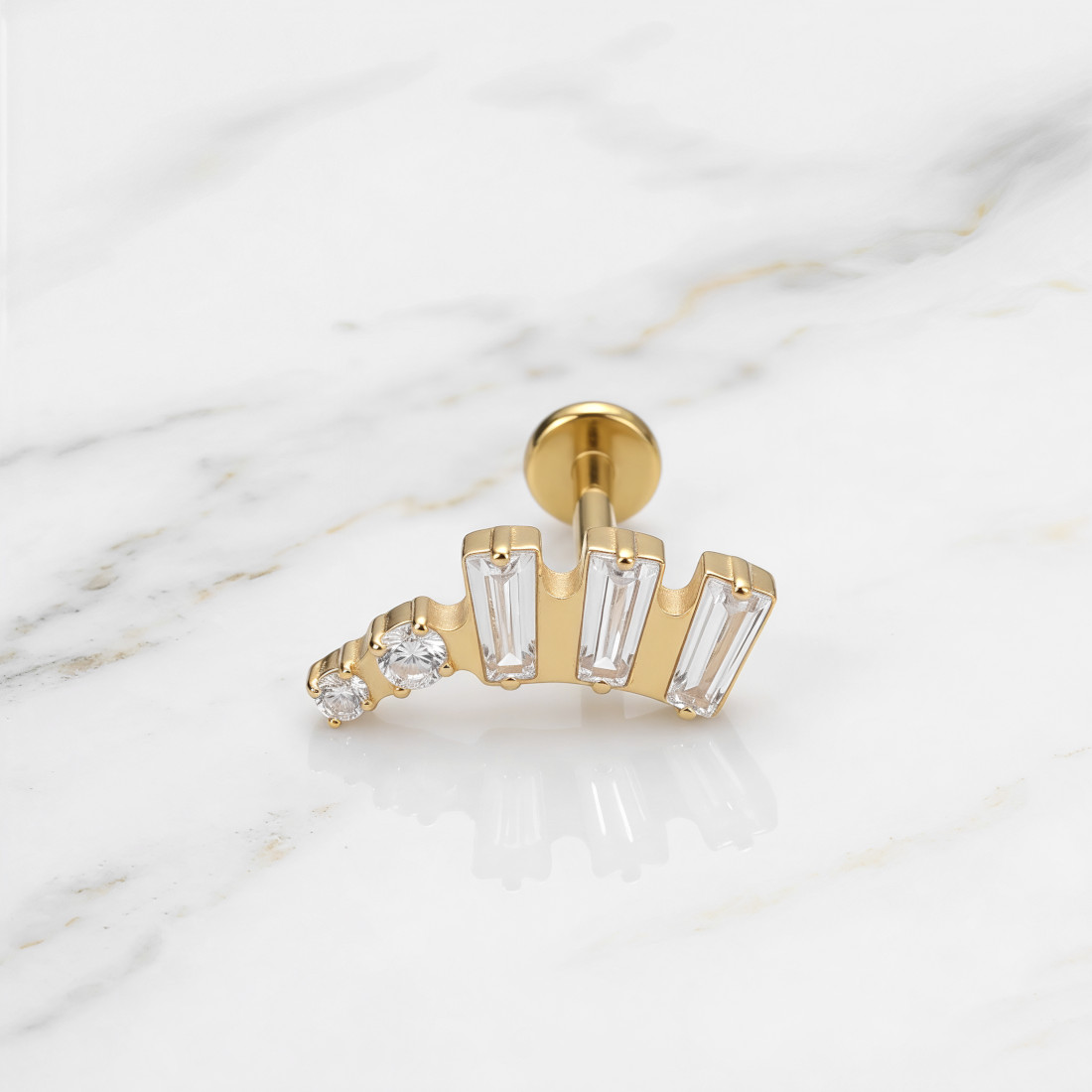 Ozdobna część labretu posiada gwint wewnętrzny, co ułatwia bezpieczną aplikację i chroni kanał przekłucia przed skaleczeniem podczas zakładania. Element dekoracyjny ma lekko wygięty, kaskadowy kształt, w którym osadzono trzy pionowe kryształki o szlifie bagietkowym oraz dwa mniejsze, okrągłe kryształy. Całość wykończona jest na wysoki połysk, co podkreśla czystość i blask zastosowanych kamieni.
