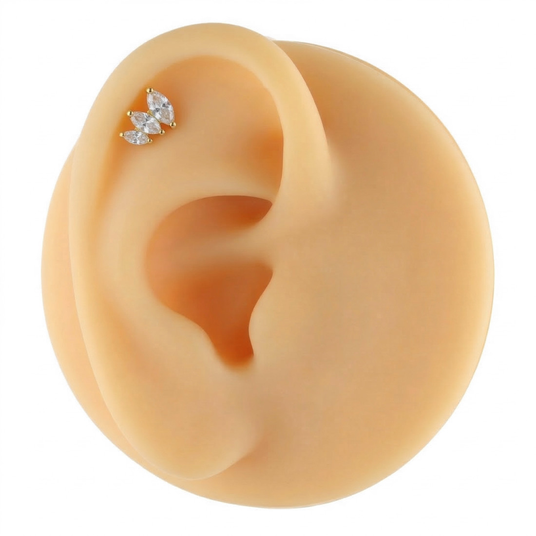 Konstrukcja kolczyka opiera się na prostym pręcie zakończonym płaskim dyskiem, co zapewnia komfort noszenia i nie powoduje ucisku. Ozdobna część składa się z trzech przezroczystych cyrkonii o szlifie marquise, które są ułożone kaskadowo według rozmiaru, tworząc subtelny łuk. Kamienie są osadzone w solidnych oprawach, które zabezpieczają je przed wypadnięciem.