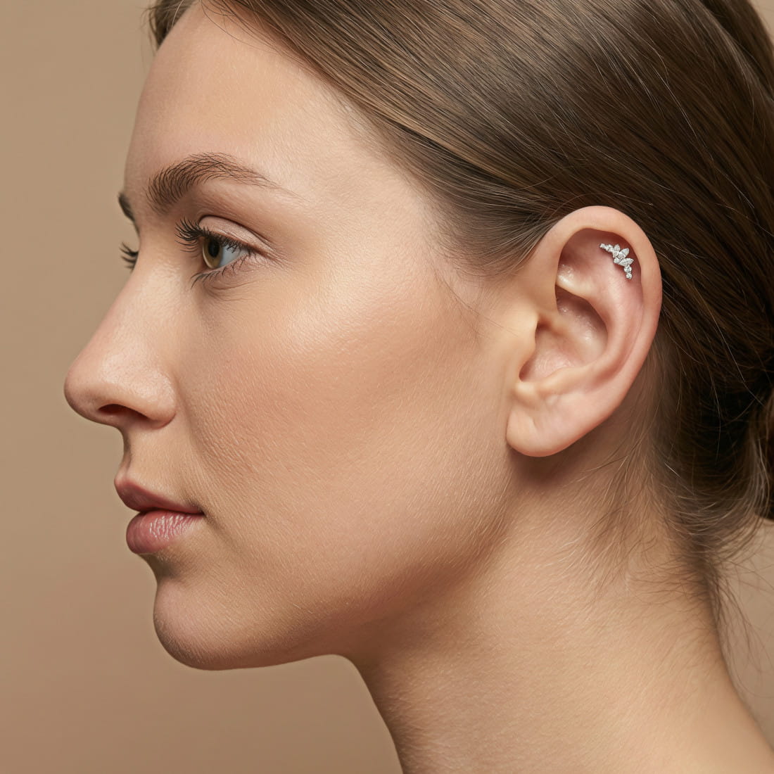 Ozdobna nakrętka w kształcie delikatnego łuku składa się z kompozycji błyszczących przeźroczystych cyrkonii, które pięknie układają się wzdłuż naturalnej krzywizny ucha.
