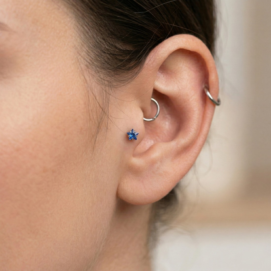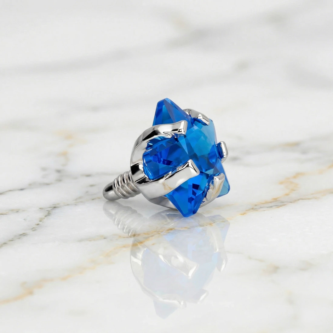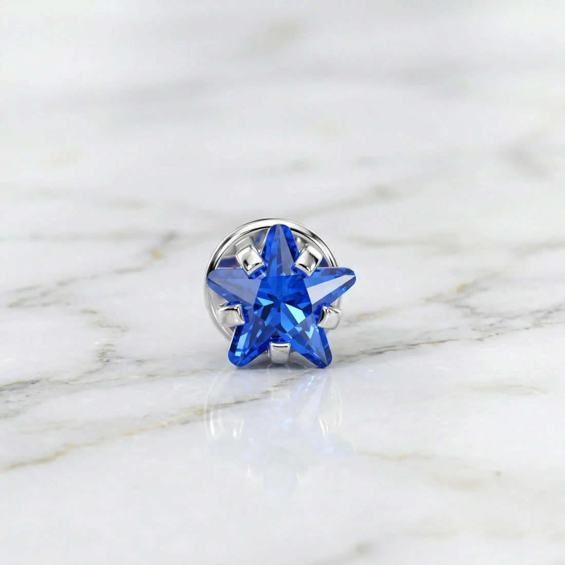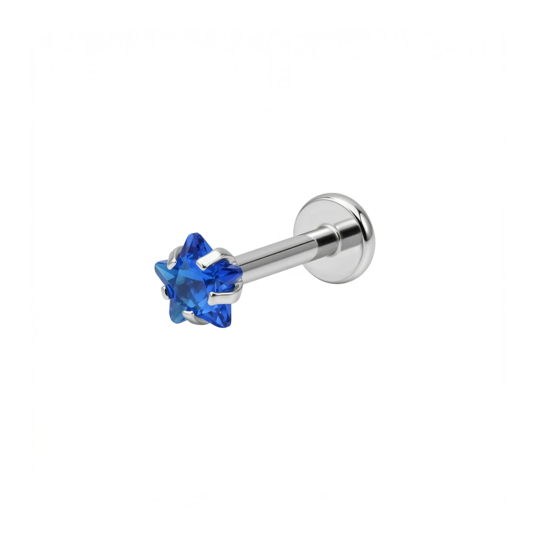 Konstrukcja kolczyka składa się z prostej sztangi zakończonej z jednej strony płaskim, zaokrąglonym dyskiem, który zapewnia wygodę noszenia i nie podrażnia tkanek wewnątrz jamy ustnej lub za uchem. Część ozdobną stanowi fasetowana cyrkonia w głębokim odcieniu niebieskiego, której nadano precyzyjny kształt pięcioramiennej gwiazdy. Kamień został osadzony w klasycznej oprawie krapowej z pięcioma solidnymi łapkami, co nie tylko zabezpiecza go przed wypadnięciem, ale również pozwala na swobodny dopływ światła, podkreślając blask szlifu.