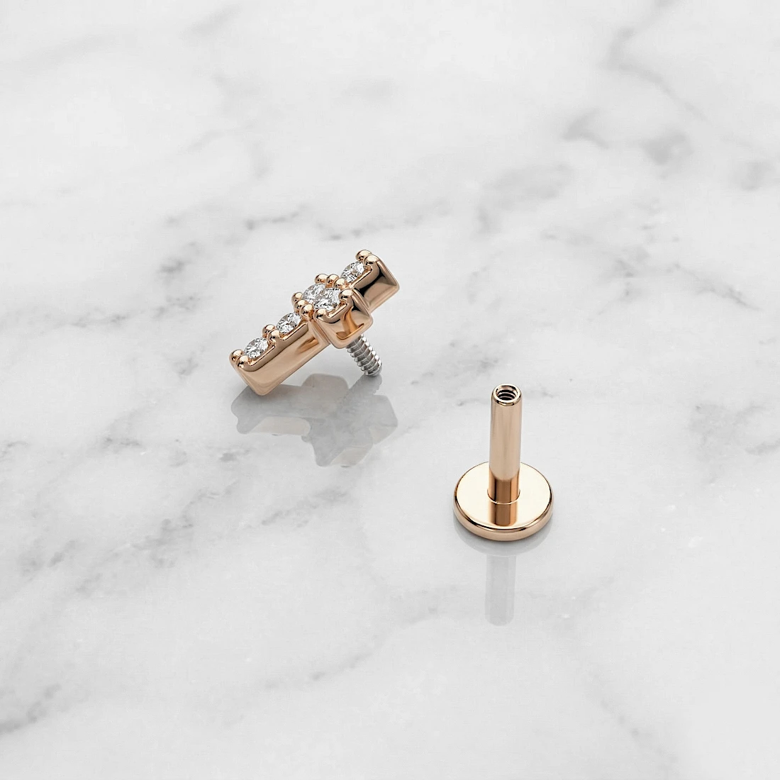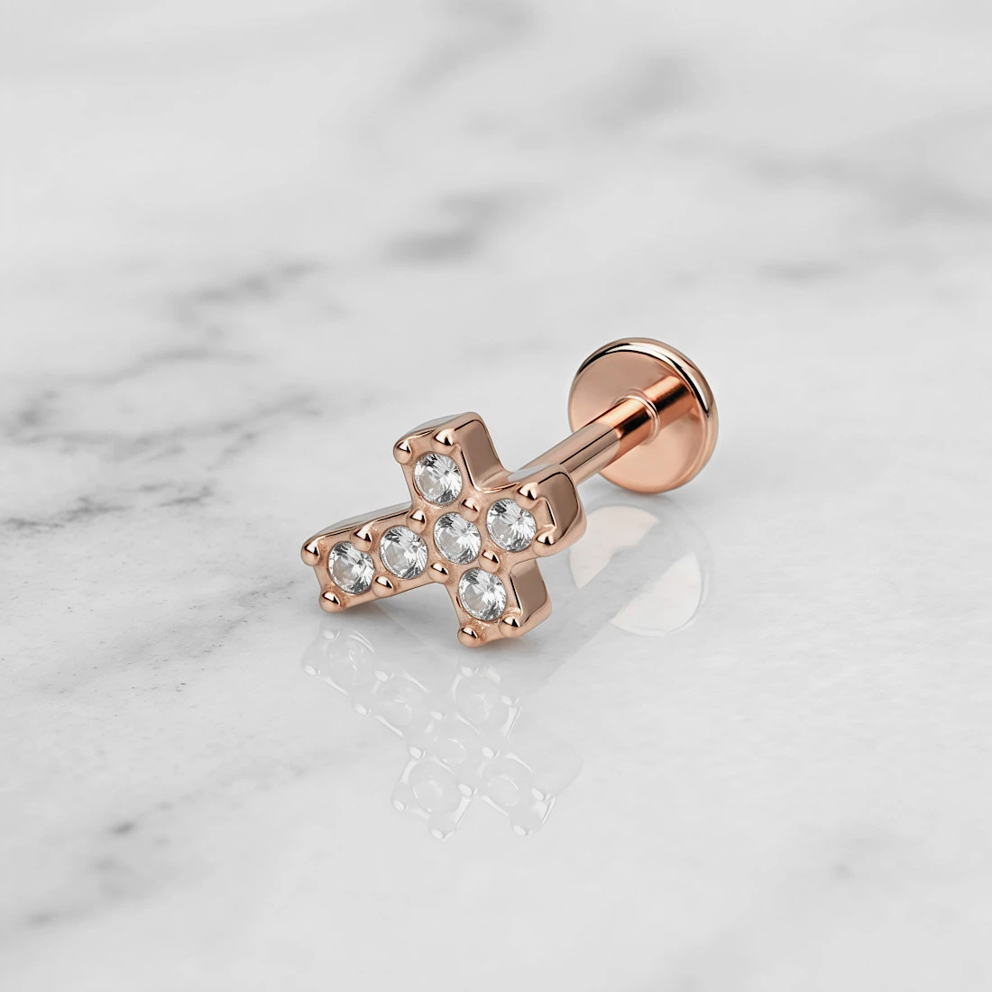 Konstrukcja kolczyka składa się z prostej szyny zakończonej z jednej strony płaskim dyskiem, a z drugiej ozdobnym elementem w kształcie krzyżyka. Ozdoba została wysadzana drobnymi, transparentnymi cyrkoniami, które są osadzone w metalowych łapkach. Labret posiada wewnętrzny system gwintowania, co zwiększa komfort podczas zakładania i minimalizuje ryzyko podrażnień kanału przekłucia. Całość wykończona jest na wysoki połysk, co podkreśla ciepły odcień różowego złota.