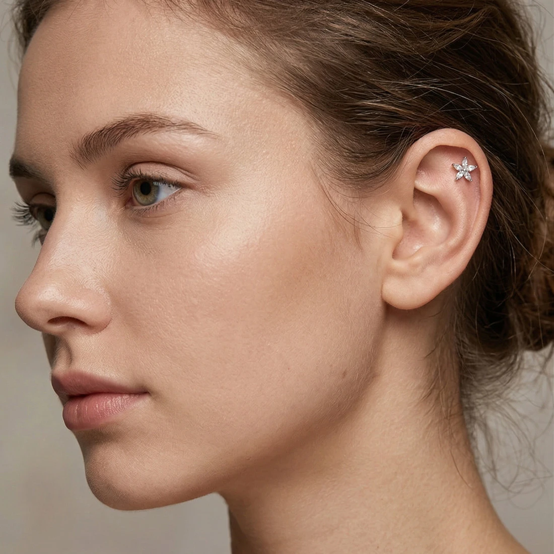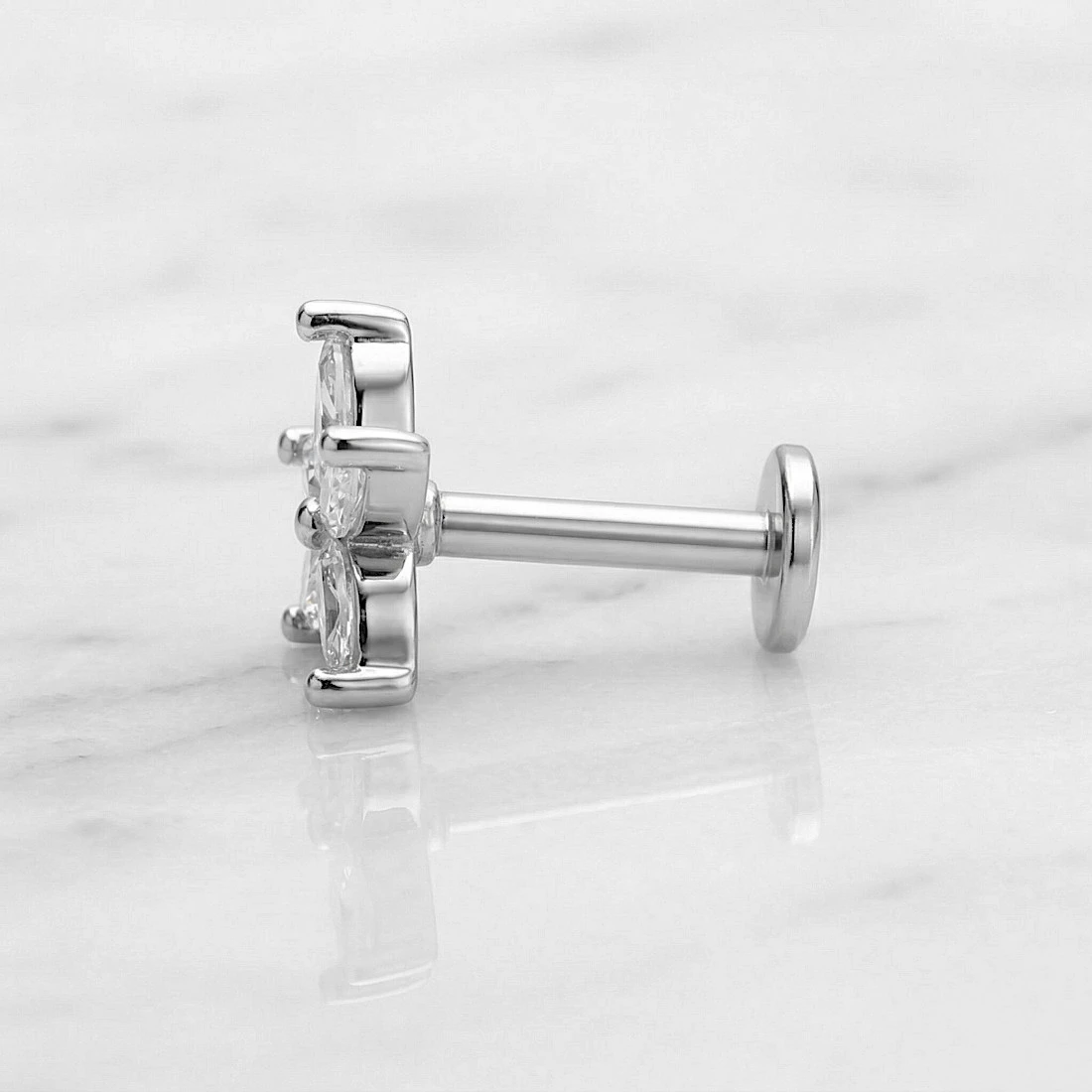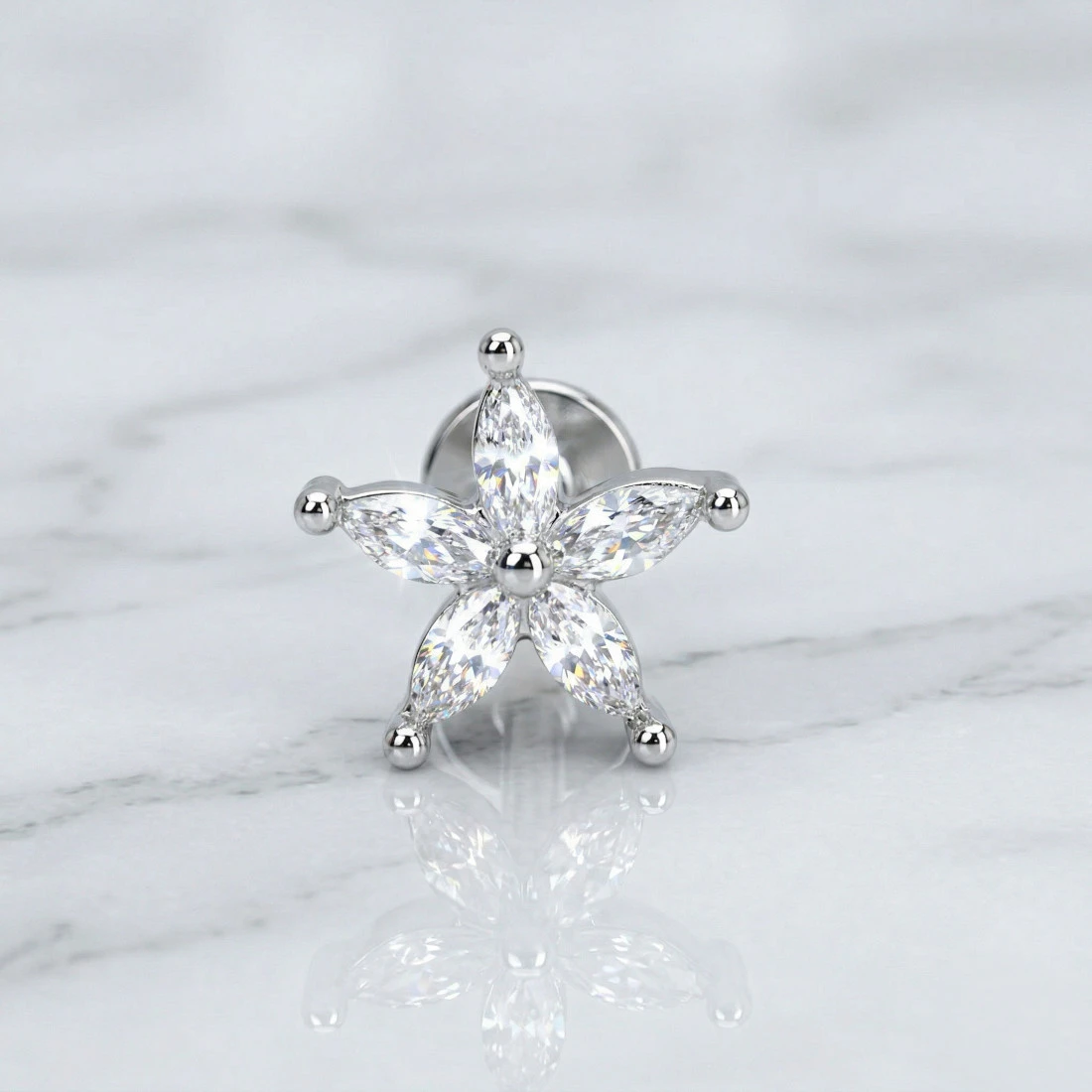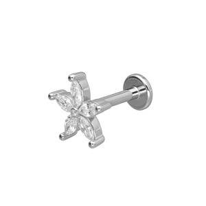 Kolczyk składa się z prostego pręta zakończonego płaskim dyskiem z jednej strony oraz ozdobnym elementem z drugiej. Część ozdobna ma formę kwiatka, którego płatki tworzy pięć cyrkonii o szlifie marquise. Centralny punkt kompozycji stanowi niewielka okrągła cyrkonia. Kamienie są osadzone w precyzyjnej oprawie krapowej, która solidnie je trzyma i eksponuje ich blask. Całość wykończona jest na wysoki połysk.