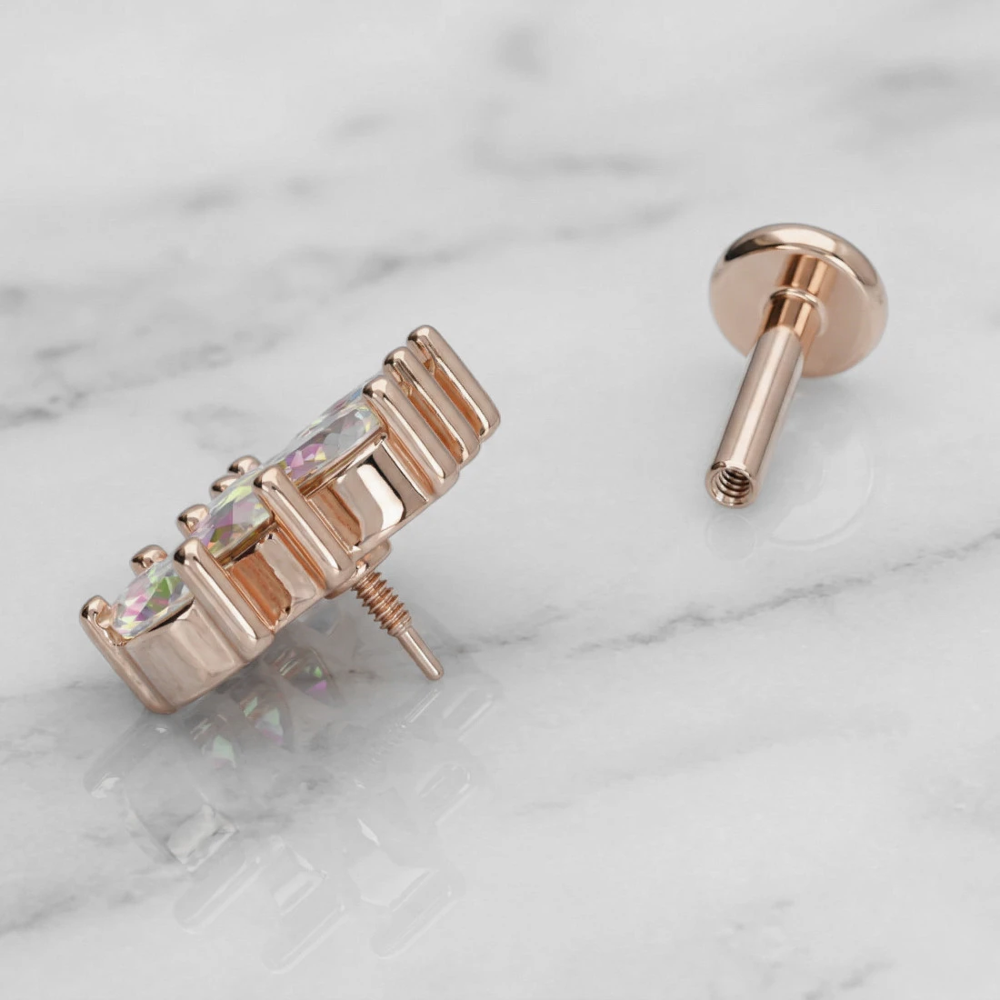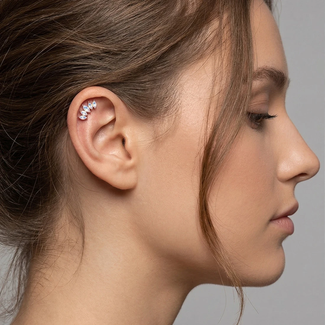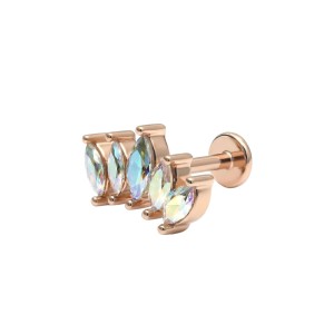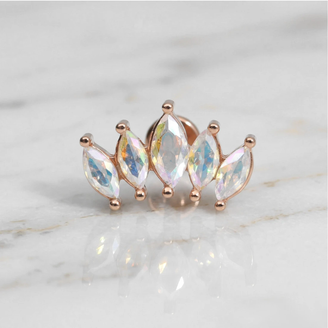 Konstrukcja kolczyka opiera się na prostym pręcie zakończonym płaskim dyskiem. Element ozdobny stanowi kompozycja pięciu kryształków o szlifie marquise, ułożonych w delikatny łuk. Kamienie mienią się wielobarwnym odcieniem aurora borealis i są osadzone w solidnych oprawach typu krapowego, które zabezpieczają je przed wypadnięciem. Model posiada gwint wewnętrzny z dłuższą śrubką typu long thread, co przekłada się na stabilność połączenia obu elementów i znacznie ułatwia samodzielne zakładanie oraz zdejmowanie biżuterii.