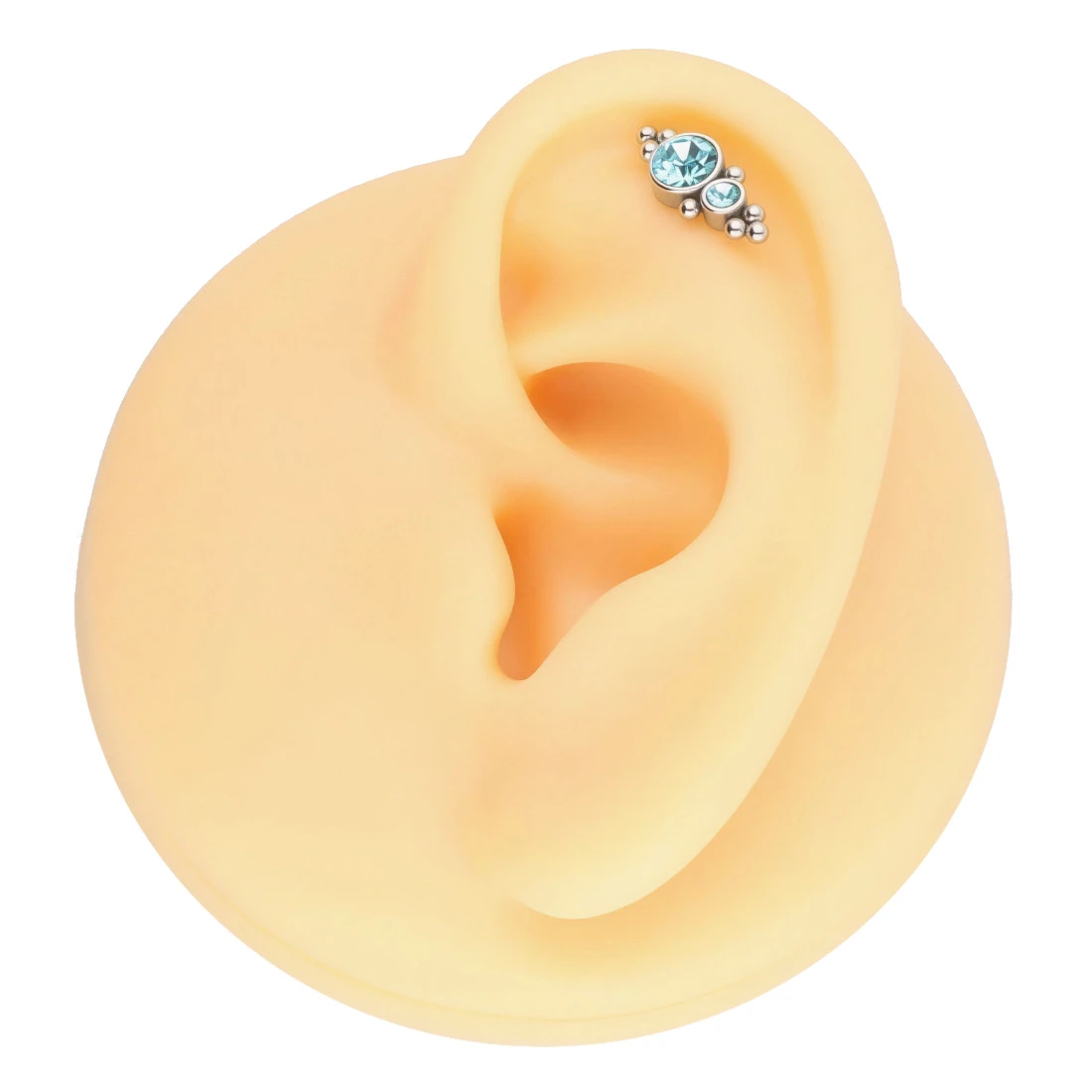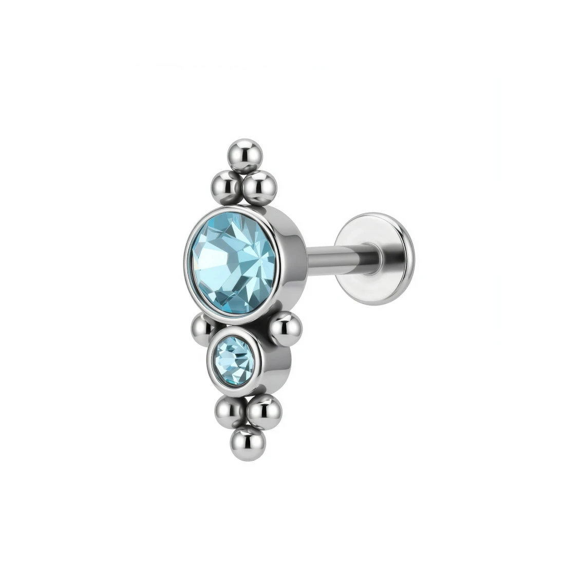 Konstrukcja kolczyka opiera się na prostym pręcie zakończonym płaskim dyskiem, co zapewnia komfort noszenia i zapobiega podrażnieniom od strony wewnętrznej. Ozdobna część labretu posiada gwint wewnętrzny, co ułatwia zakładanie biżuterii i chroni kanał przekłucia przed zadrapaniami podczas aplikacji. Element dekoracyjny ma formę pionowej kompozycji składającej się z dwóch błękitnych cyrkonii o różnej średnicy, osadzonych w gładkich oprawach typu bazel. Całość dopełniają symetrycznie rozmieszczone, drobne kuleczki ze stali, które nadają ozdobie geometryczny charakter.