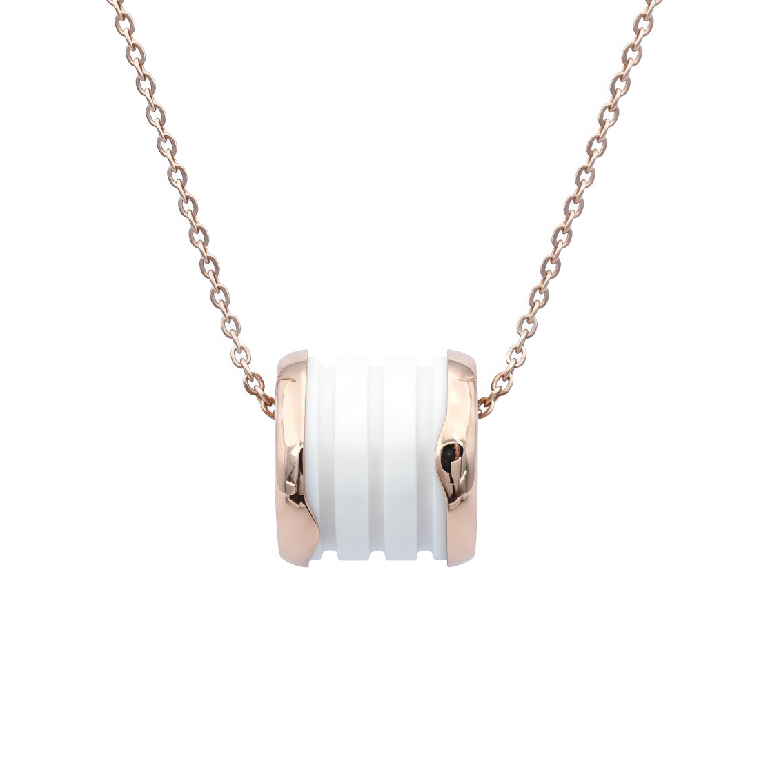 Połączenie białej ceramiki z różowym złotem nadaje naszyjnikowi wyrafinowany i modny wygląd. Kontrast materiałów i kolorów jest subtelny, ale przyciąga wzrok.