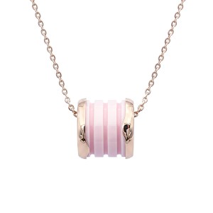 Efektowny naszyjnik ze Stali 316L w kolorze różowego złota, uzyskanego metodą PVD. Ma nowoczesny i elegancki design. Składa się z delikatnego łańcuszka oraz unikalnej zawieszki w formie walca z różowym, ceramicznym środkiem. Obręcze walca wykonane są z metalu w kolorze różowego złota i zdobione wyrytymi rzymskimi cyframi od I do XII, przypominającymi pierścień zegara.