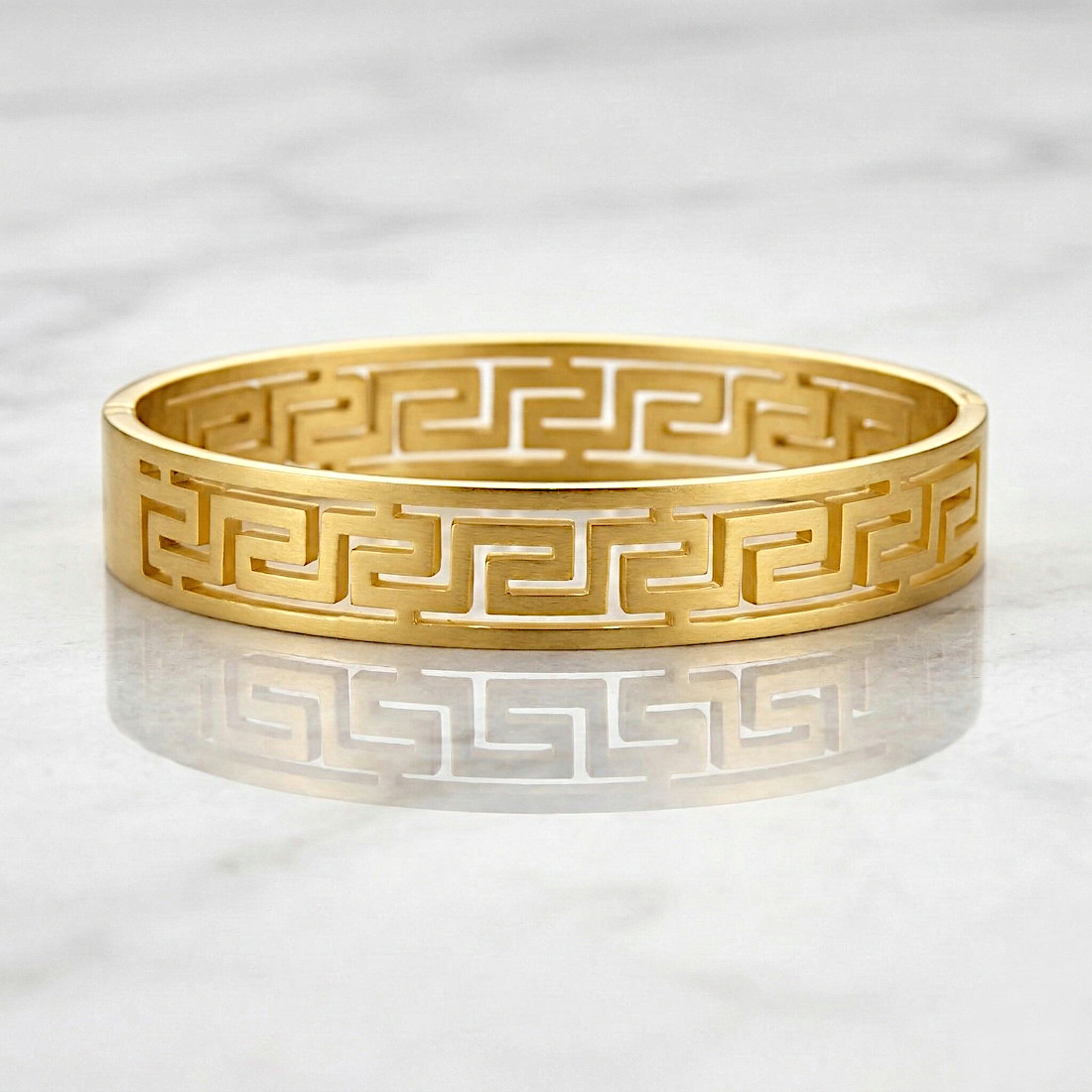 Charakterystyczną cechą obrączki jest ażurowa konstrukcja z wyciętym powtarzalnym, geometrycznym wzorem. Motyw ten to klasyczny grecki meander, znany również jako "grecki klucz", składający się z łamanych linii tworzących labiryntowy ornament.
