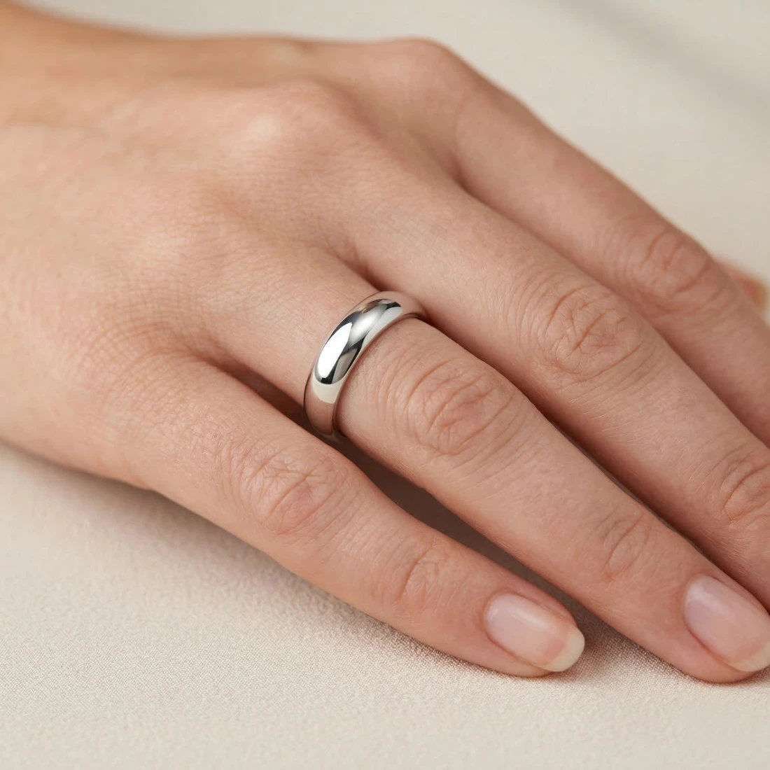 Konstrukcja pierścionka opiera się na prostym, ponadczasowym wzornictwie. Obrączka ma gładką, polerowaną powierzchnię o wysokim połysku, która równomiernie odbija światło. Jej profil jest delikatnie wypukły na zewnątrz, co nadaje biżuterii optycznej lekkości, natomiast wnętrze wyprofilowano tak, aby zapewnić komfort podczas noszenia i łatwość zakładania.