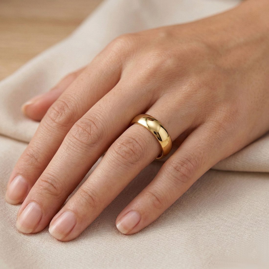 Klasyczna obrączka o półokrągłym profilu wykonana z wysokiej jakości stali szlachetnej. Materiał ten charakteryzuje się wyjątkową trwałością, odpornością na zarysowania oraz właściwościami hipoalergicznymi, dzięki czemu jest bezpieczny dla osób o wrażliwej skórze. Złoty kolor naniesiono metodą PVD (Physical Vapor Deposition). Jest to nowoczesna technologia napylania próżniowego, która gwarantuje wysoką trwałość powłoki, odporność na ścieranie oraz chroni powierzchnię przed korozją i utratą blasku podczas codziennego użytkowania.