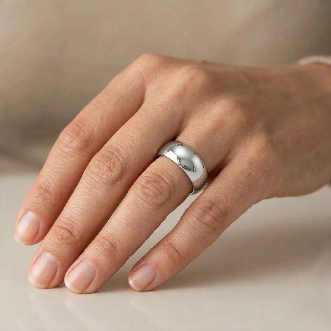 Klasyczna szeroka srebrna obrączka o półokrągłym profilu wykonana z wysokiej jakości stali szlachetnej. Materiał ten charakteryzuje się wyjątkową trwałością, odpornością na zarysowania oraz właściwościami hipoalergicznymi, dzięki czemu jest bezpieczny dla osób o wrażliwej skórze.