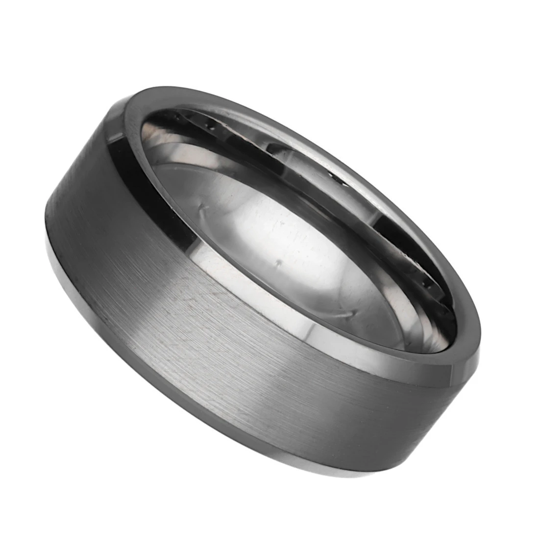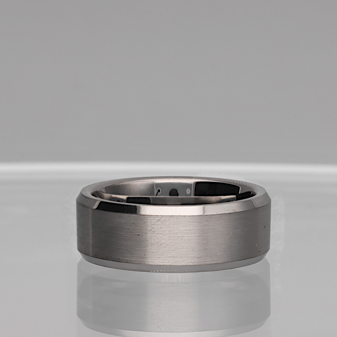 Klasyczna obrączka wykonana z wysokiej jakości wolframu, ciemnoszarego, ciężkiego metalu charakteryzującego się niezwykłą wytrzymałością i odpornością. Jej zewnętrzna powierzchnia charakteryzuje się nowoczesnym, matowym wykończeniem ze szczotkowaną teksturą, co nadaje jej subtelny, męski charakter. Krawędzie obrączki są fazowane i wysoko polerowane, co tworzy kontrastujący, lśniący akcent i dodaje elegancji. Wnętrze obrączki jest również polerowane, zapewniając komfortowe noszenie. Kolor obrączki to głęboka szarość, zbliżona do koloru tytanu.