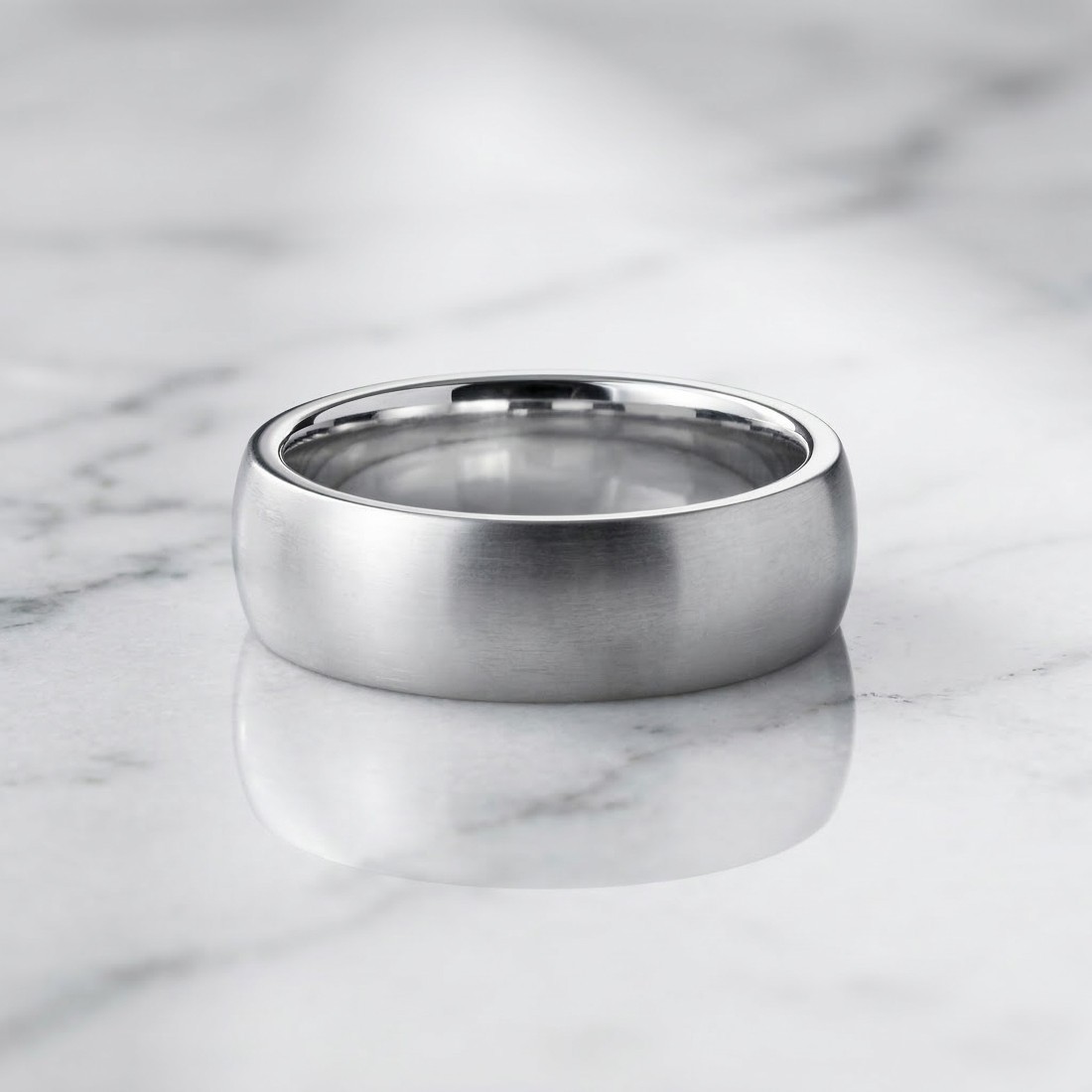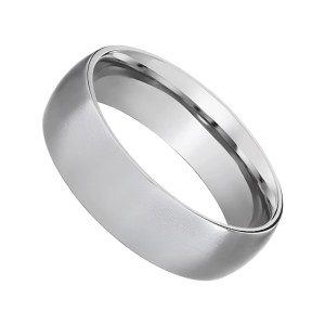 Produkt posiada klasyczny, półokrągły profil o znacznej szerokości, co zapewnia mu solidną i wyraźną strukturę. Zewnętrzna powierzchnia obrączki została poddana starannemu procesowi matowienia, co nadaje jej satynowe, nieodbijające światła wykończenie. Wnętrze jest gładkie i wyprofilowane w sposób gwarantujący wygodę podczas codziennego noszenia.