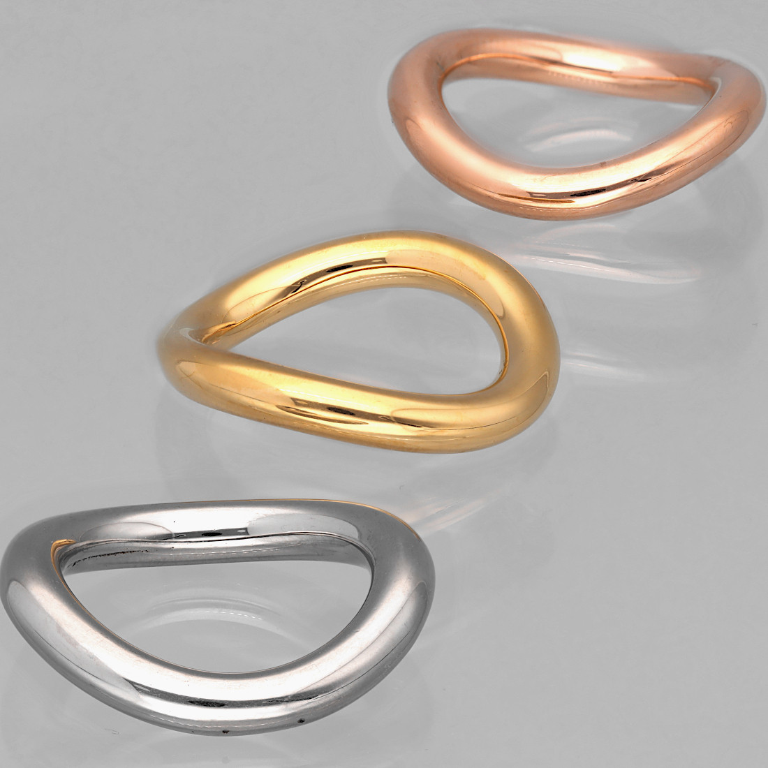 Design obrączki jest rzeźbiarski i minimalistyczny, przyciąga wzrok swoim unikatowym, opływowym kształtem. Jest to idealny wybór dla osób ceniących współczesną biżuterię o artystycznym charakterze i wyrafinowanej prostocie.