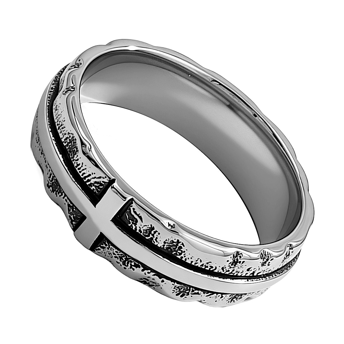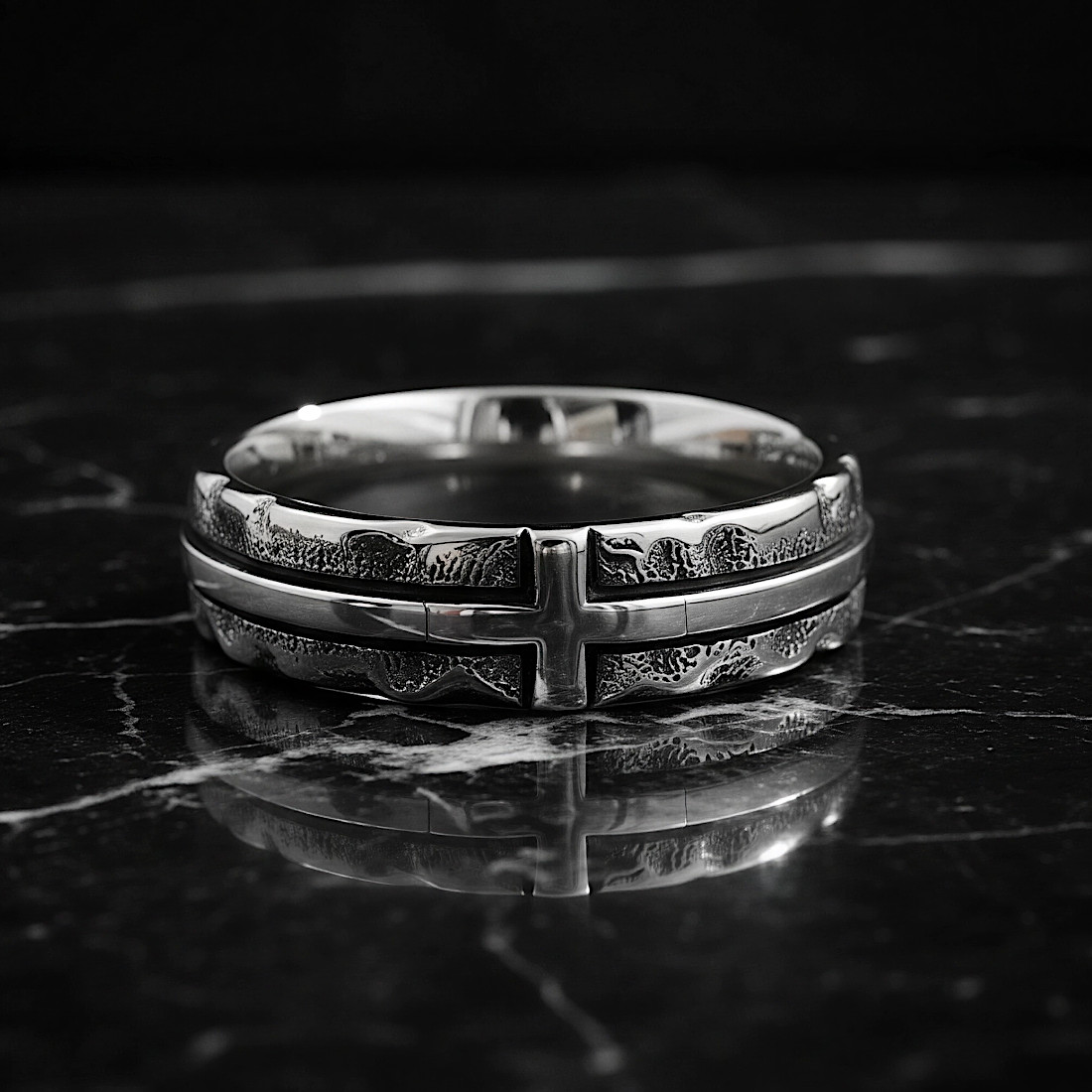 Głównym elementem ozdobnym jest poziomy krzyż, który przecina środek obrączki, tworząc geometryczną ozdobę. Krawędzie obrączki są faliste, a jej górna i dolna część ma wyraźną, chropowatą teksturę, przypominającą kute żelazo lub kamień. Środkowa część obrączki, w której umieszczony jest krzyż, jest gładka i polerowana.
