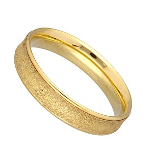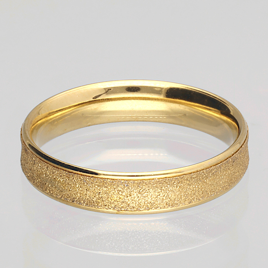 Centralna część obrączki ozdobiona jest piaskowaną fakturą, a jej krawędzie są polerowane na wysoki połysk.