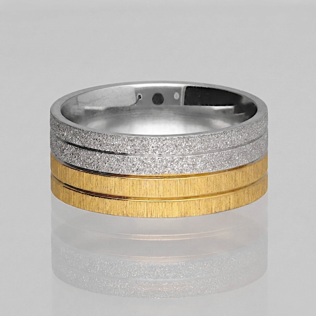 Połączenie polerowanego złota z matową i lśniącą stalą tworzy wyjątkową grę świateł i tekstur. Obrączka jest trwała, hipoalergiczna i odporna na uszkodzenia, co czyni ją idealnym wyborem na symboliczny prezent lub stylowy dodatek na co dzień.