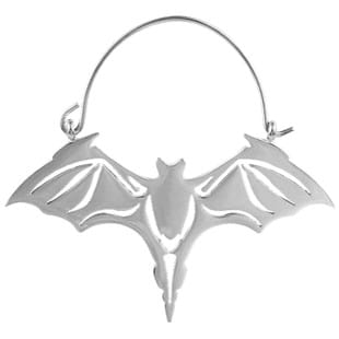 Element ozdobny kolczyka ma kształt lecącego nietoperza. Na skrzydłach nietoperza widoczne są wycięcia imitujące ich strukturę.
