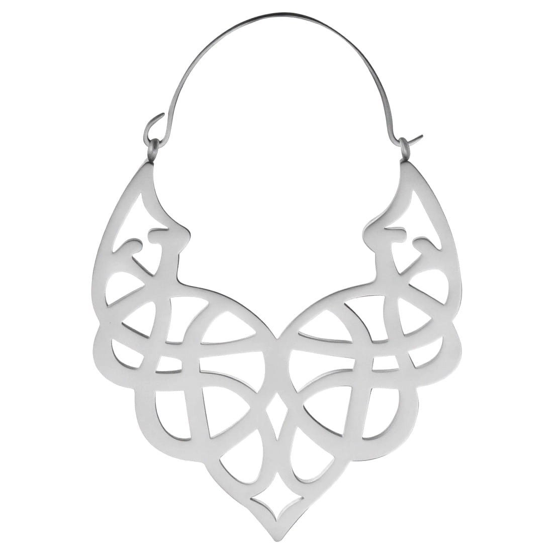 Duży efektowny ażurowy kolczyk w naturalnym srebrnym kolorze. Przeznaczony do noszenia wraz z tunelem lub bezpośrednio w standardowym przekłuciu płatka ucha.