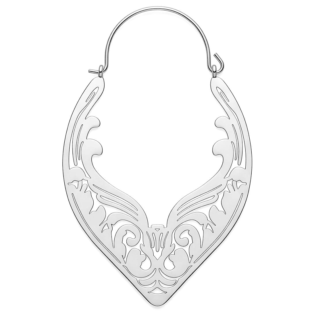 Ozdobną część kolczyka stanowi zawieszka o wydłużonym, szpiczastym kształcie. Wewnątrz tego kształtu znajduje się ażurowy, bogaty wzór składający się z misternie wyciętych elementów, przypominających pnącza, liście lub tribalowe ornamenty. Tworzy to efekt "koronki" lub splotu z pustymi przestrzeniami prześwitującymi przez kolczyk.