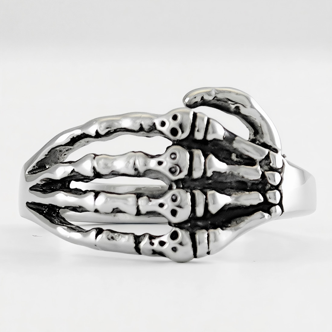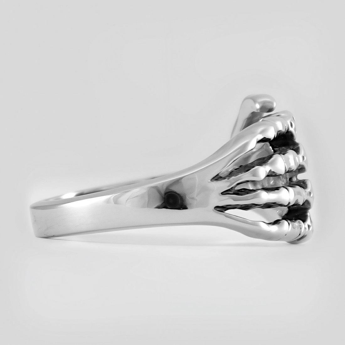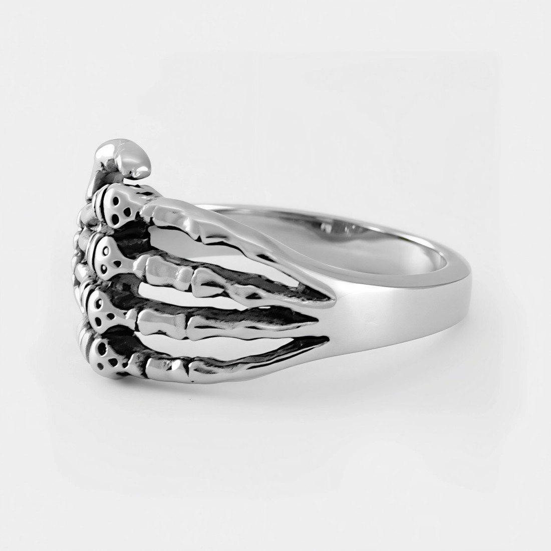 Konstrukcja sygnetu przedstawia szczegółowo odwzorowaną dłoń kościotrupa, która oplata palec. Poszczególne paliczki i stawy zostały wyraźnie zaznaczone, tworząc trójwymiarową strukturę frontu biżuterii. Wykończenie łączy w sobie elementy polerowane na wysoki połysk z celowymi przyciemnieniami w zagłębieniach, co uwydatnia detale anatomiczne i nadaje całości głębi. Tylna część obrączki jest gładka i zwęża się ku dołowi, co zapewnia swobodę ruchu i komfort noszenia.