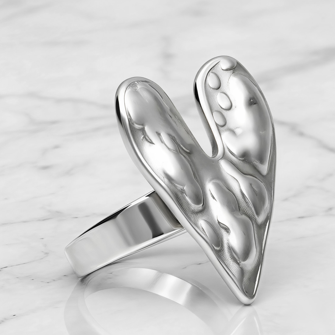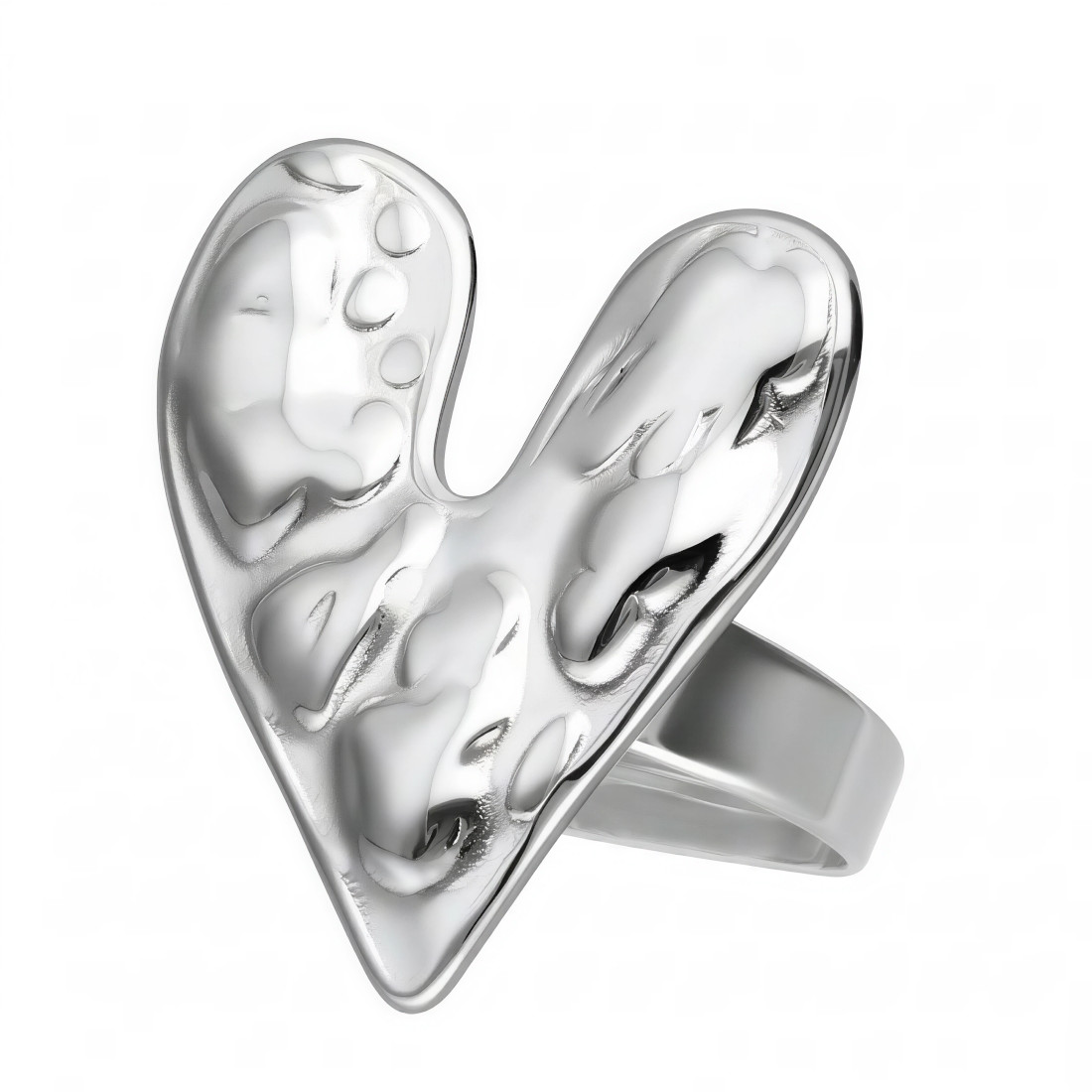 Ozdobny regulowany srebrny pierścień ze stali szlachetnej, materiału przyjaznego dla skóry, trwałego, odpornego na korozję. Front ma kształt niesymetrycznego serca w dość niekonwencjonalnej formie. Powierzchnia przypomina stopiony metal z wgłębieniami i wypukłościami, co nadaje trójwymiarowości i sprawia, że światło odbija się w interesujący sposób.