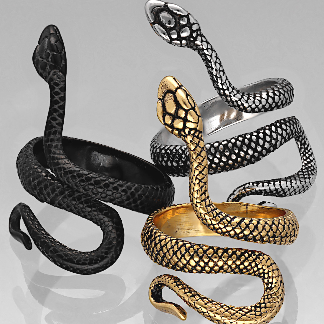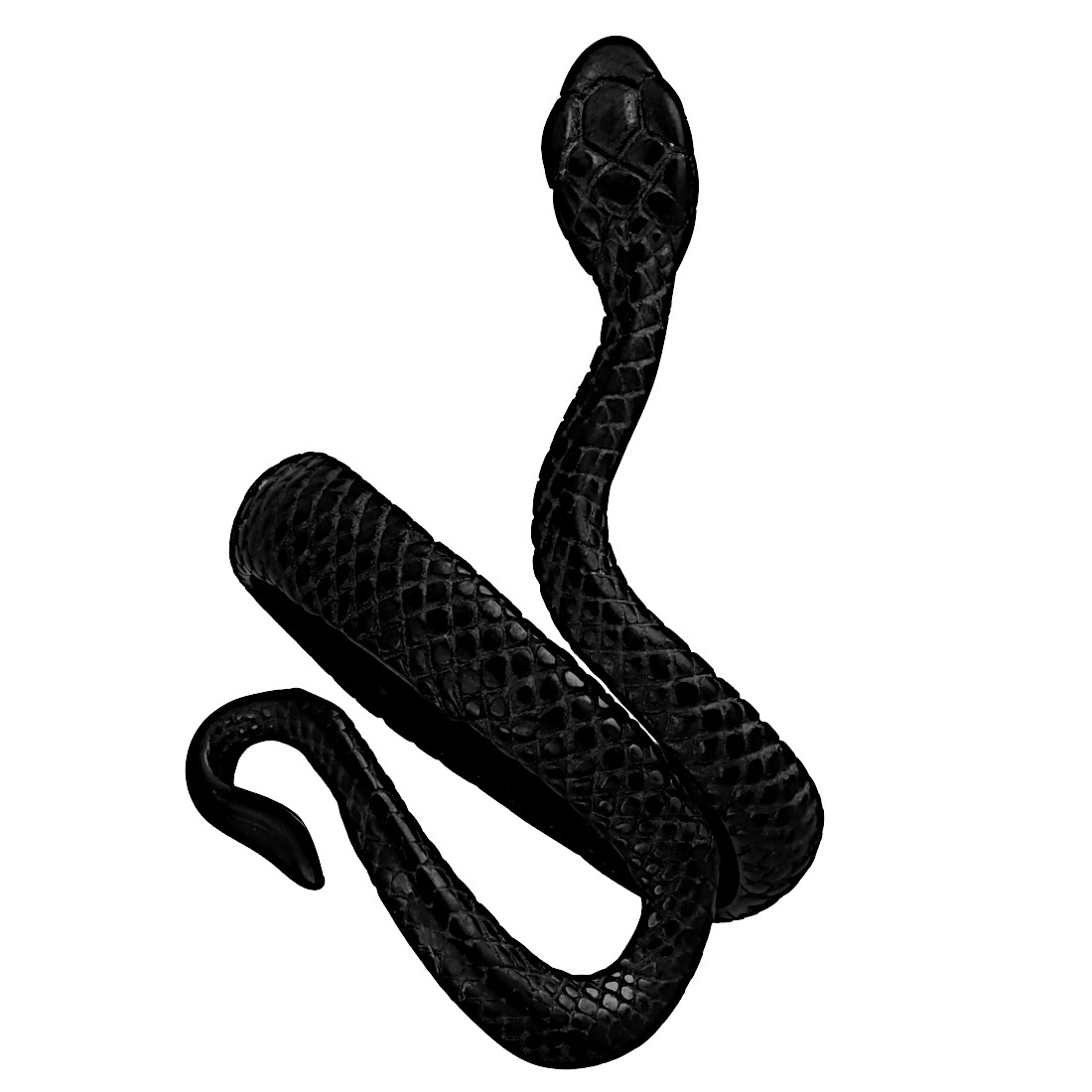 Pierścień ma formę smukłego, misternie wyrzeźbionego węża, który owija się spiralnie wokół palca. Wąż ma uniesioną głowę, która, tak jak całe ciało jest bogato zdobiona detalami, co nadaje mu realistyczny wygląd. Czarne, błyszczące wykończenie pierścienia oraz motyw węża podkreśla jego mroczny i tajemniczy charakter.