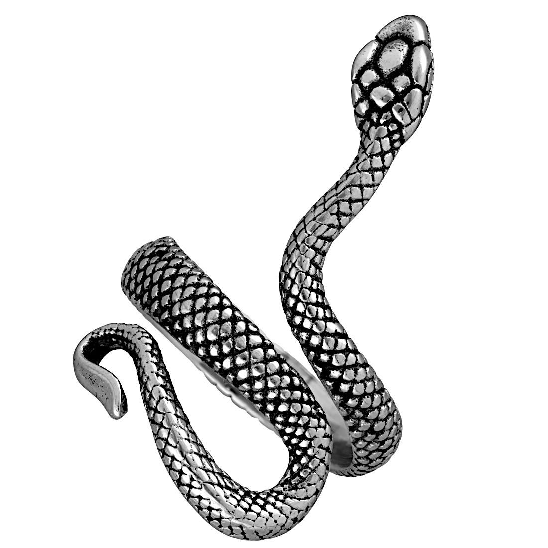 Wyrazisty srebrny pierścień z oksydowanej stali szlachetnej, materiału gwarantującego trwałość, a także bezpieczeństwo dla skóry. Ma formę smukłego, misternie wyrzeźbionego węża, który owija się spiralnie wokół palca. Wąż ma uniesioną głowę, która, tak jak całe ciało jest bogato zdobiona detalami, co nadaje mu realistyczny wygląd.