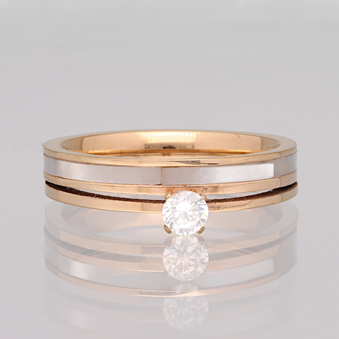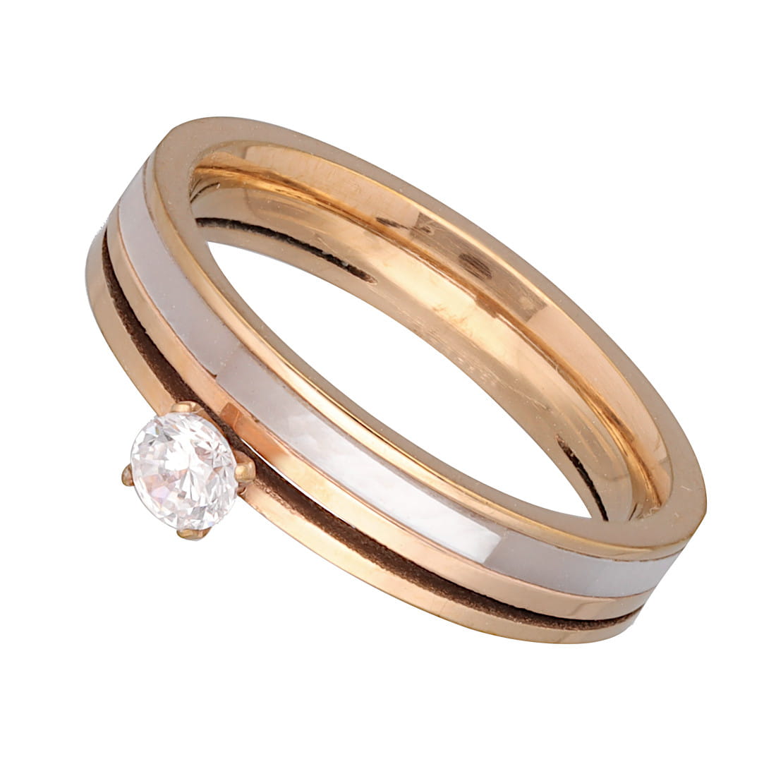 Podwójna obrączka stalowa z masą perłową i cyrkonią - różowe złoto