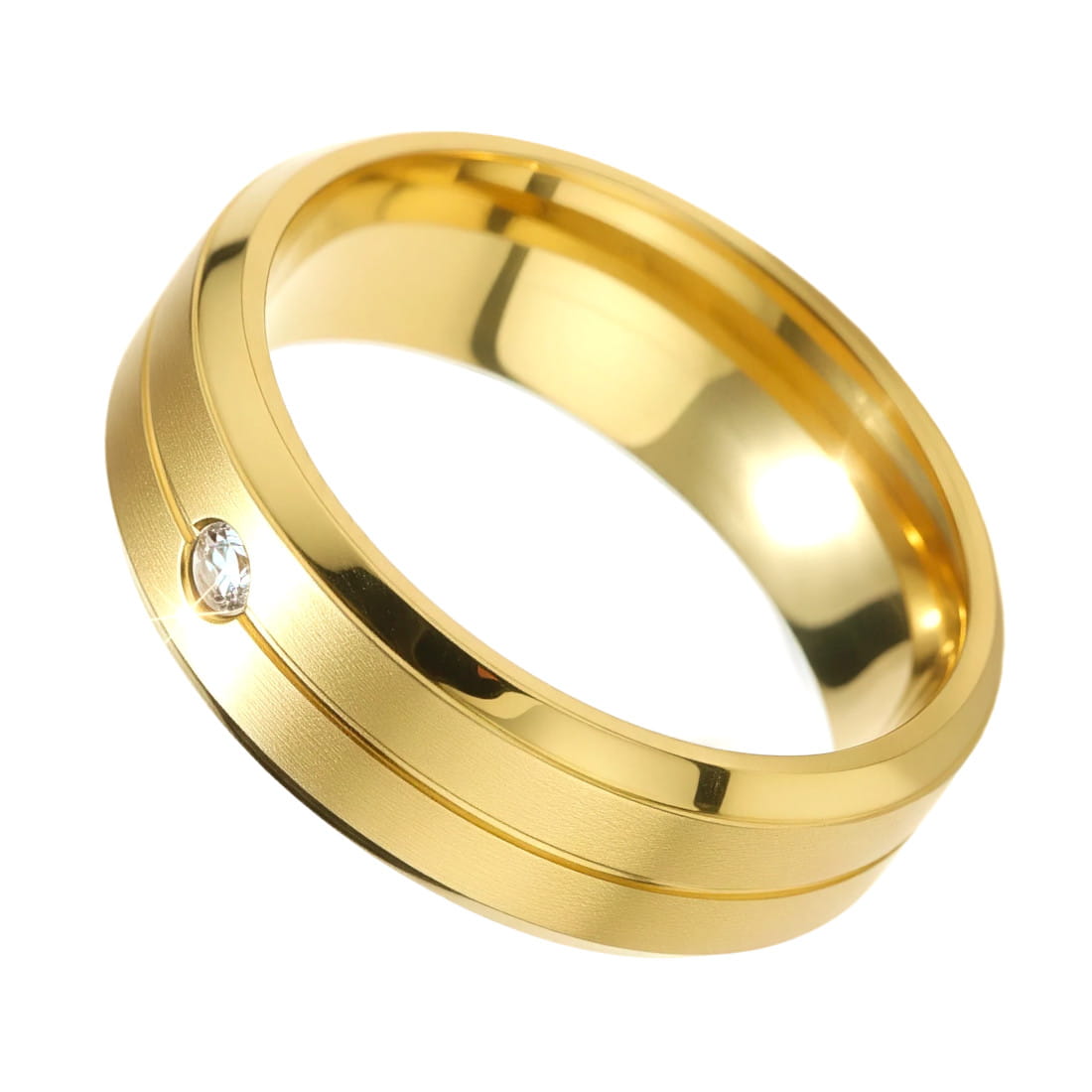 Efektowna złota obrączka wykonana jest ze stali szlachetnej, co gwarantuje trwałość i jest bezpieczne dla skóry. Kolorowa powłoka została naniesiona trwałą metodą PVD (Physical Vapour Deposition).
