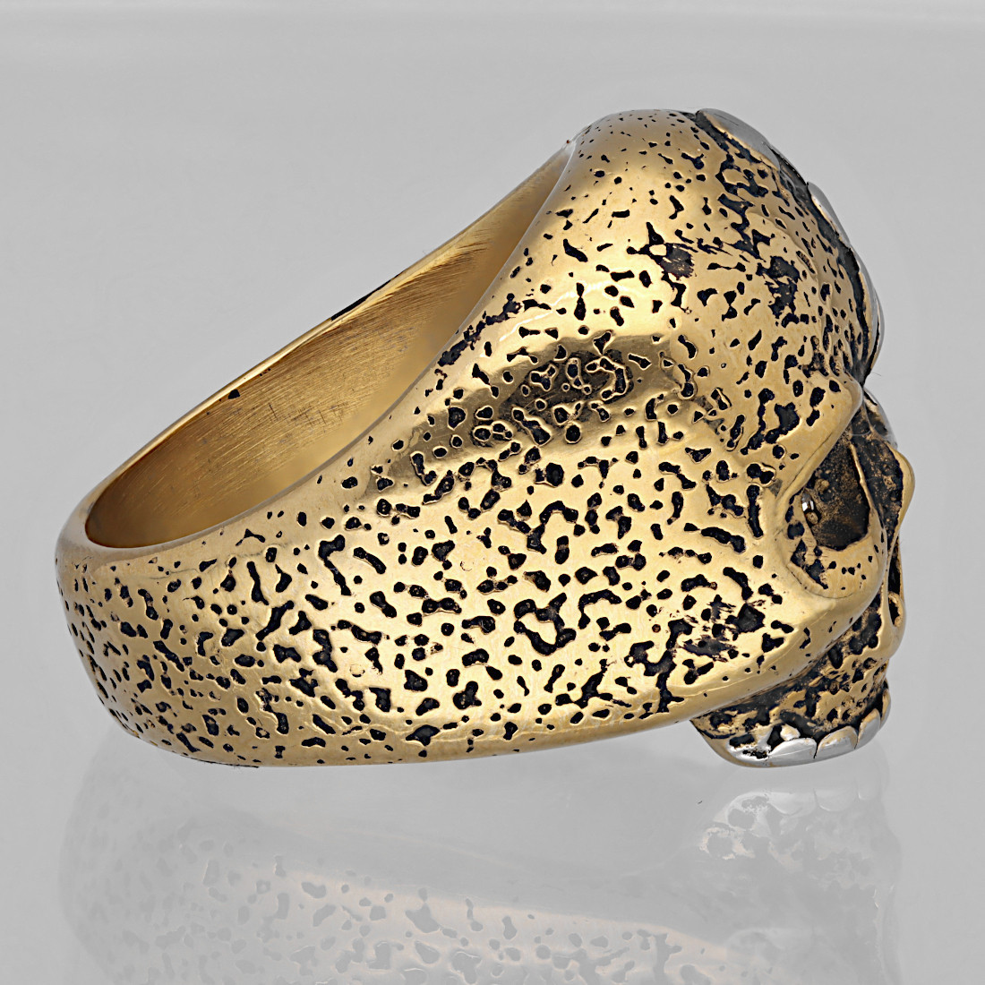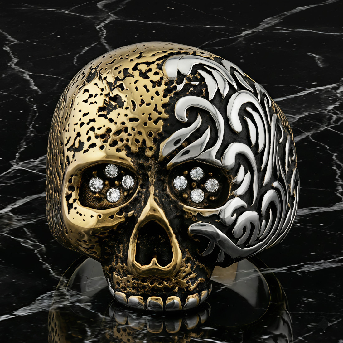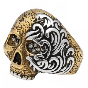 Front pierścienia zdobi realistycznie odwzorowana czaszka, której jedna strona pokryta jest intrygującym, złotym wykończeniem o chropowatej, fakturowanej powierzchni, nadającej jej antyczny wygląd, podczas gdy druga strona czaszki i boki pierścienia utrzymane są w klasycznym, srebrnym kolorze stali, tworząc dynamiczny kontrast. Dodatkowo, oczodoły czaszki zostały ozdobione drobnymi, błyszczącymi kryształkami, które dodają pierścieniowi subtelnego blasku i elegancji, stanowiąc intrygujący akcent dla surowego motywu. Jeden bok pierścienia oraz część czaszki pokrywają precyzyjnie wykonane, wypukłe, srebrne ornamenty przypominające stylizowane płomienie, które wspaniale kontrastują z ciemniejszym tłem, nadając całości barokowego, a jednocześnie rockowego charakteru.