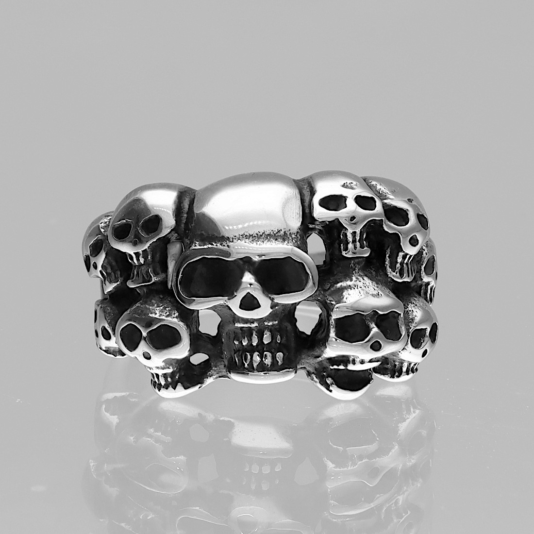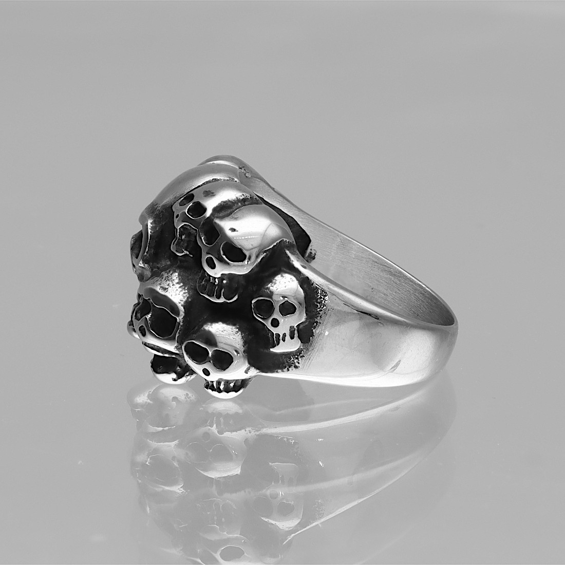 Sygnet przedstawia misternie wykonany motyw splecionych ze sobą czaszek, tworząc efektowny i mroczny wzór. Każda czaszka została starannie wyrzeźbiona z dbałością o detale, co nadaje pierścieniowi trójwymiarowy i realistyczny wygląd.