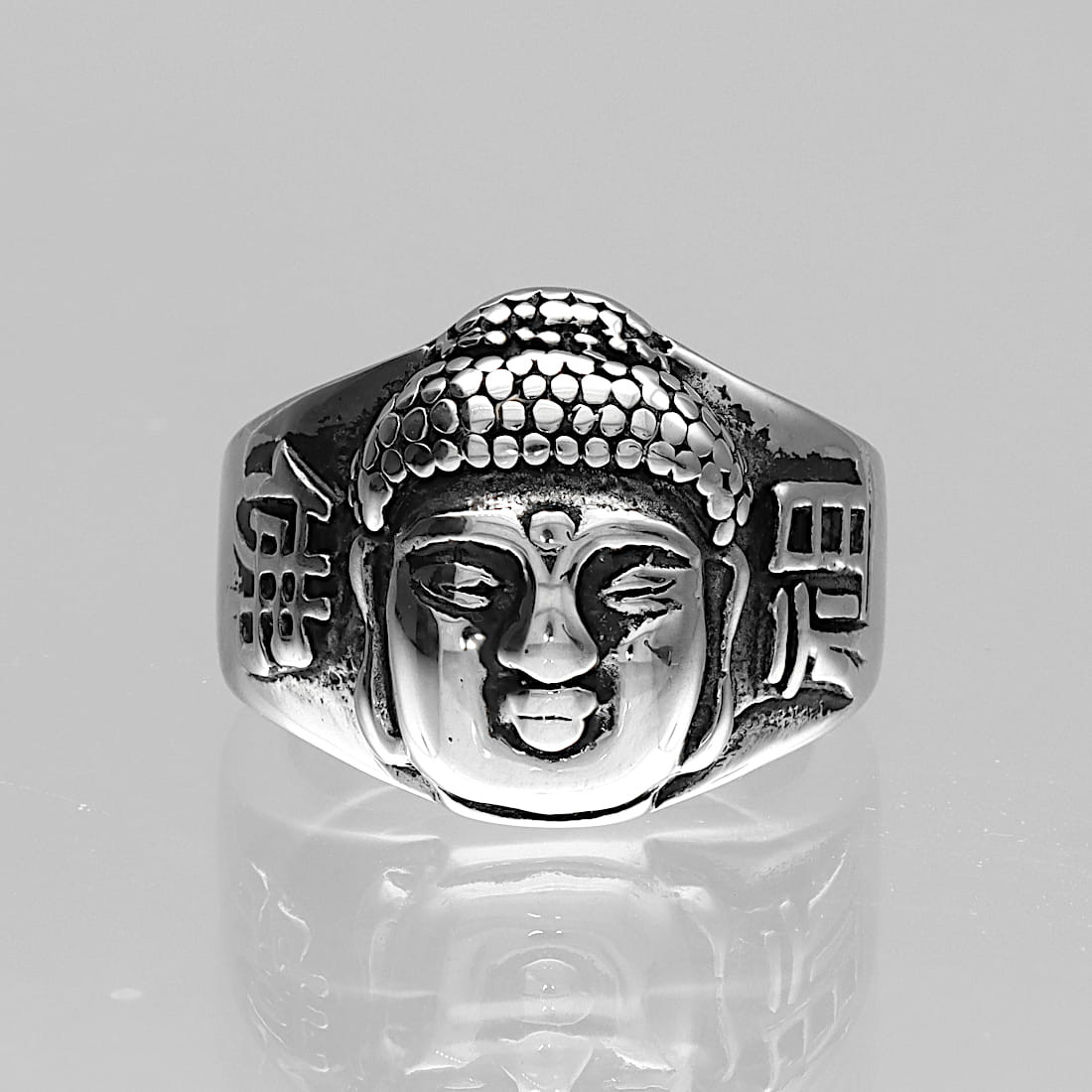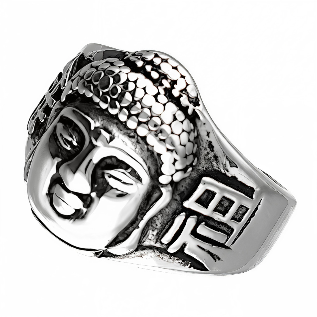 Ma formę sygnetu z trójwymiarową głową Buddy, która dominuje w centralnej części pierścienia. Wizerunek jest wykonany z dużą precyzją, widać wyraźnie drobne elementy, takie jak loki włosów ułożone w misterny wzór, charakterystyczny guzek na czubku głowy, a także spokojną, medytującą minę Buddy.