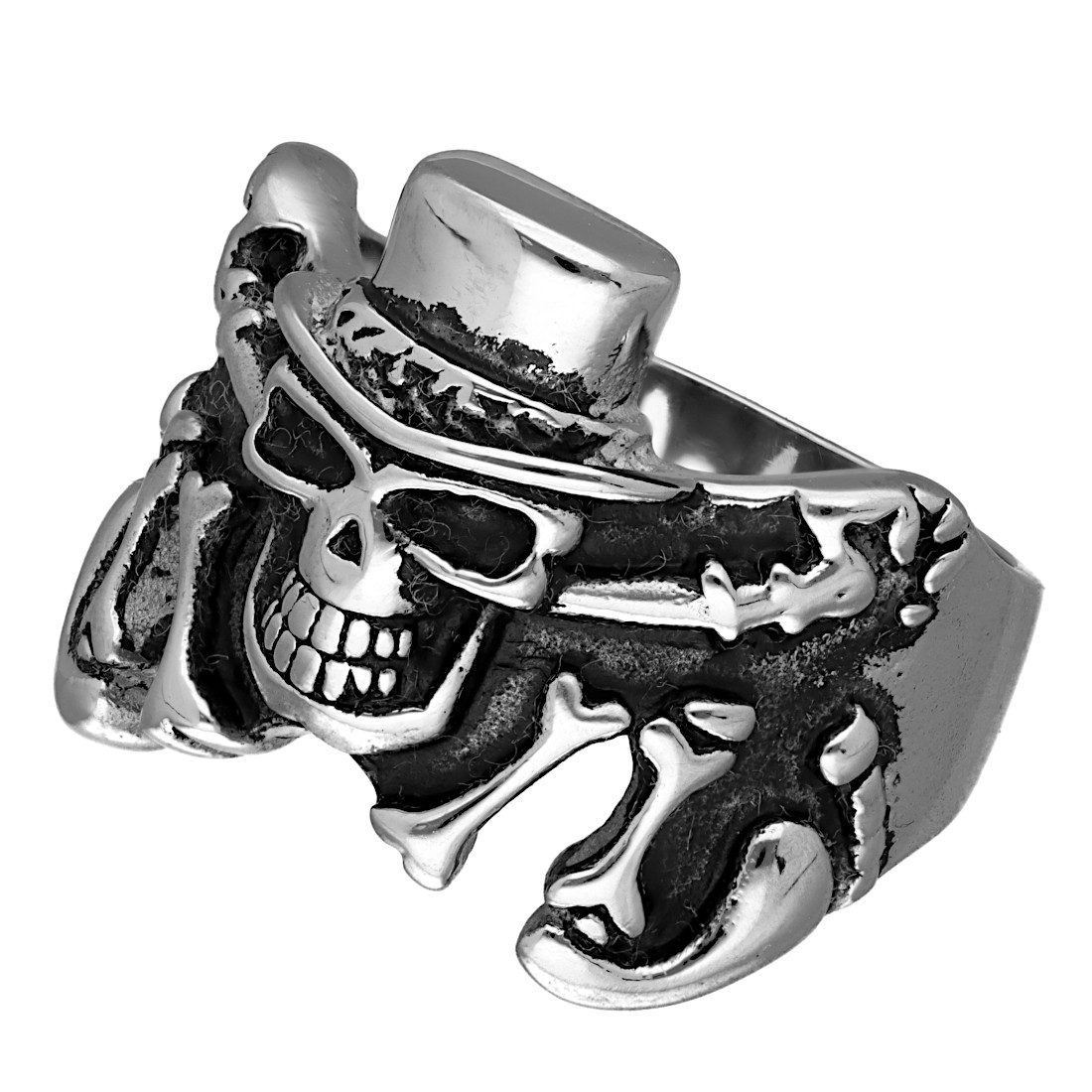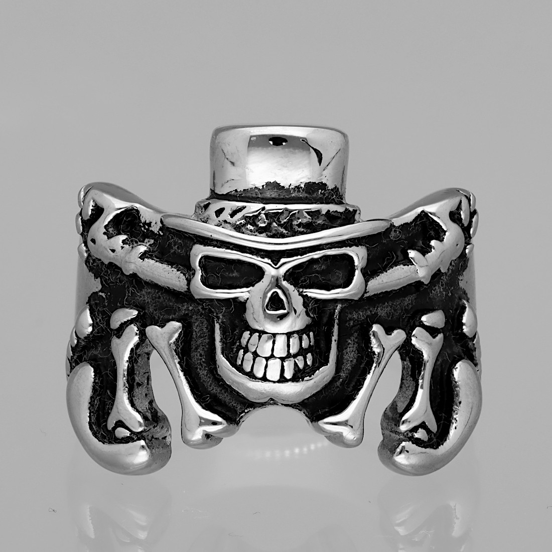 Sygnet stalowy CZASZKA W CYLINDRZE - srebrny