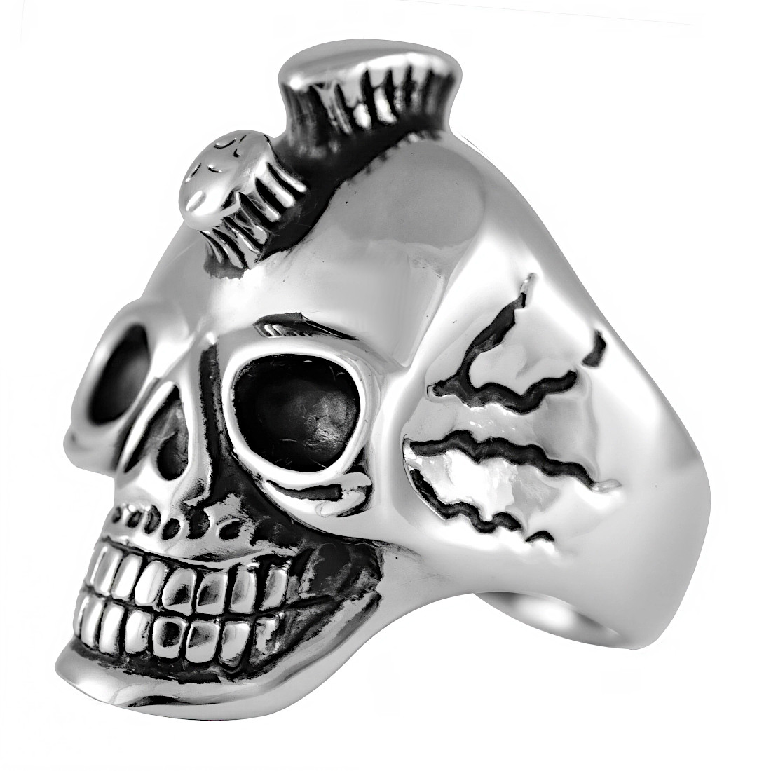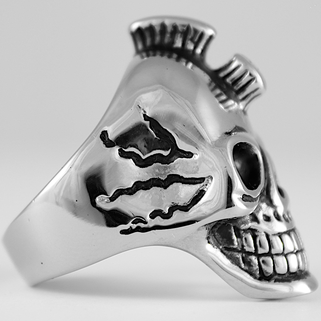 Masywny srebrny pierścień ze Stali Chirurgicznej 316L, materiału przyjaznego dla skóry, trwałego, odpornego na korozję. Pierścień ma formę sygnetu w formie trójwymiarowej czaszki. Czaszka ma wyraźnie zaznaczone oczodoły, nos, zęby i charakterystyczne żłobienia na policzkach. Na czubku głowy widoczny jest element przypominający punkowego irokeza. Sygnet na zdjęciu to nietypowy i oryginalny pierścień, który wyróżnia się swoim unikatowym designem. Jego awangardowy styl sprawia, że jest to idealny wybór dla osób, które lubią wyrazistą biżuterię.