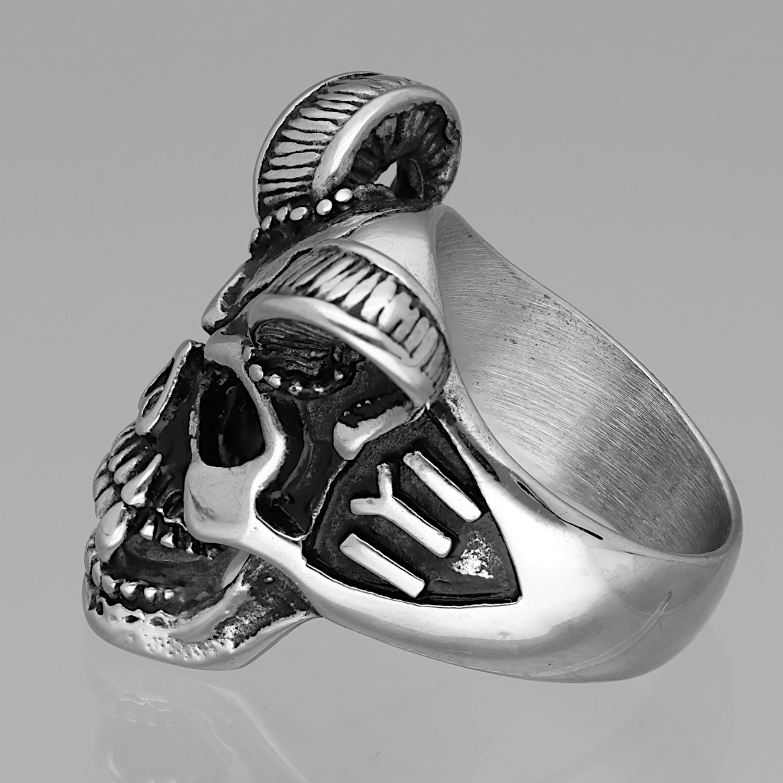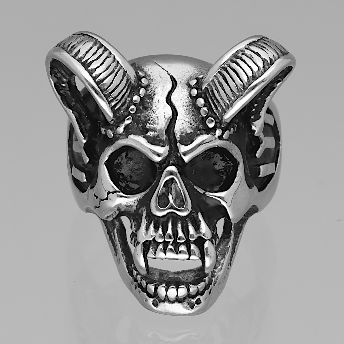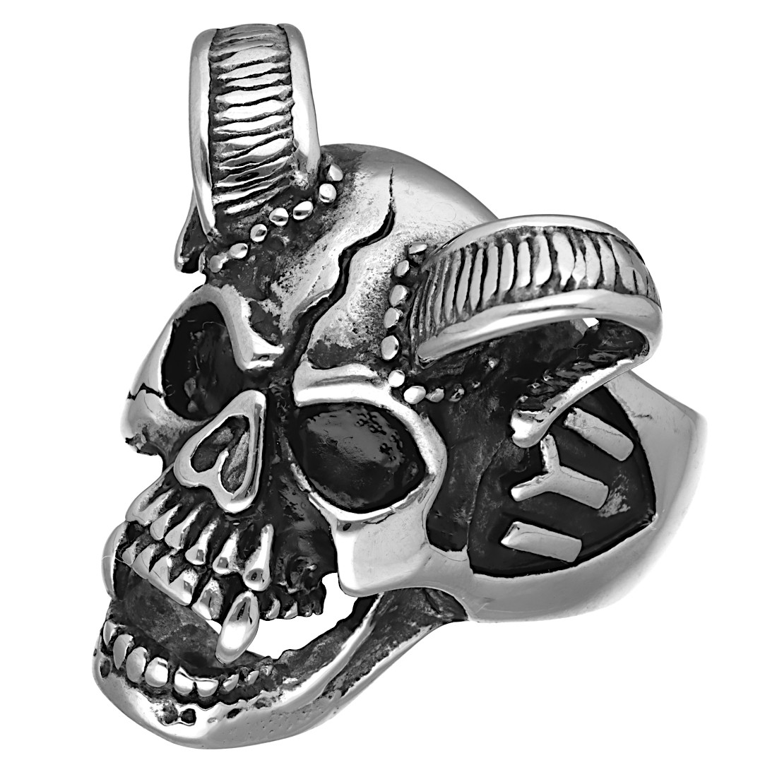 Sygnet stalowy CZASZKA Z ROGAMI - srebrny
