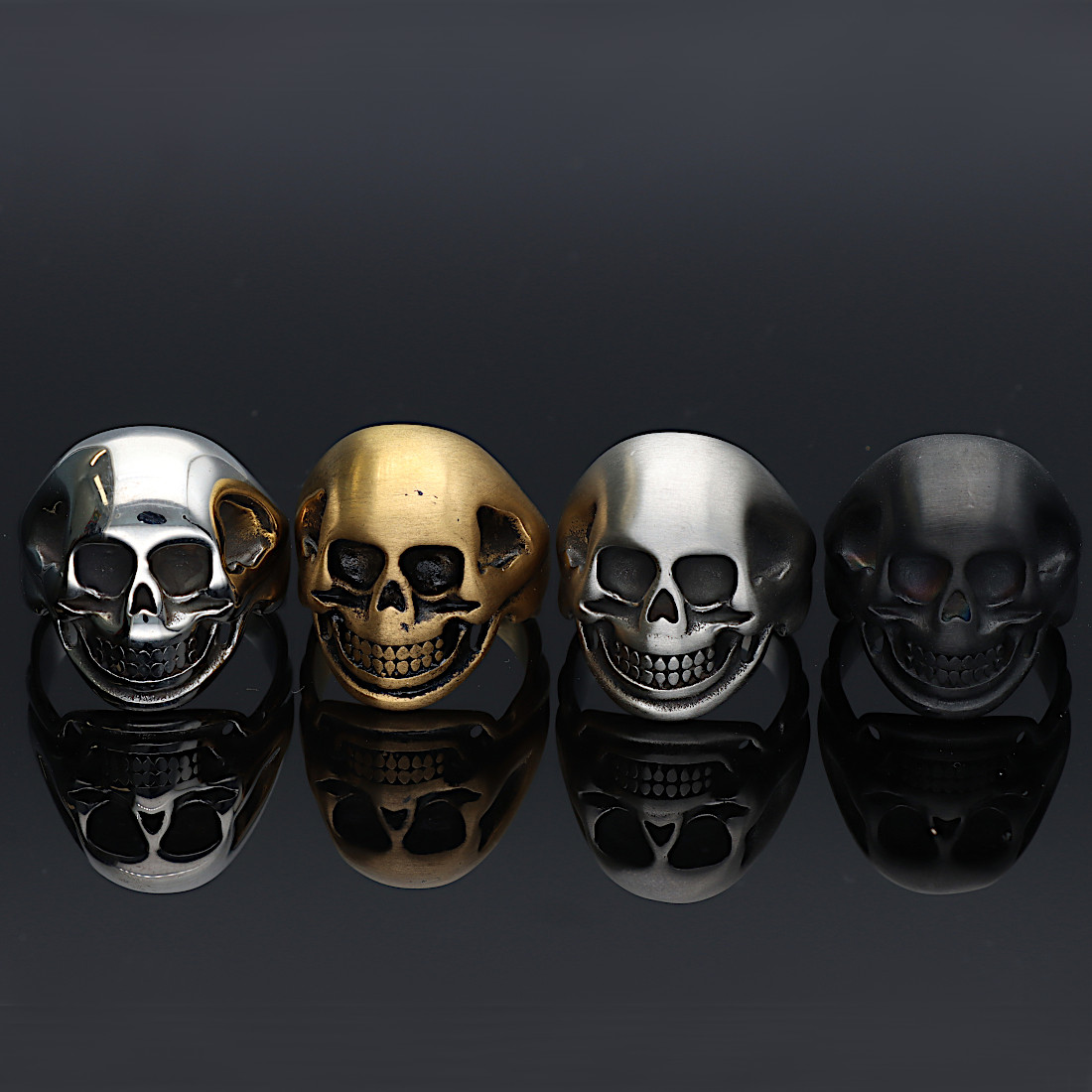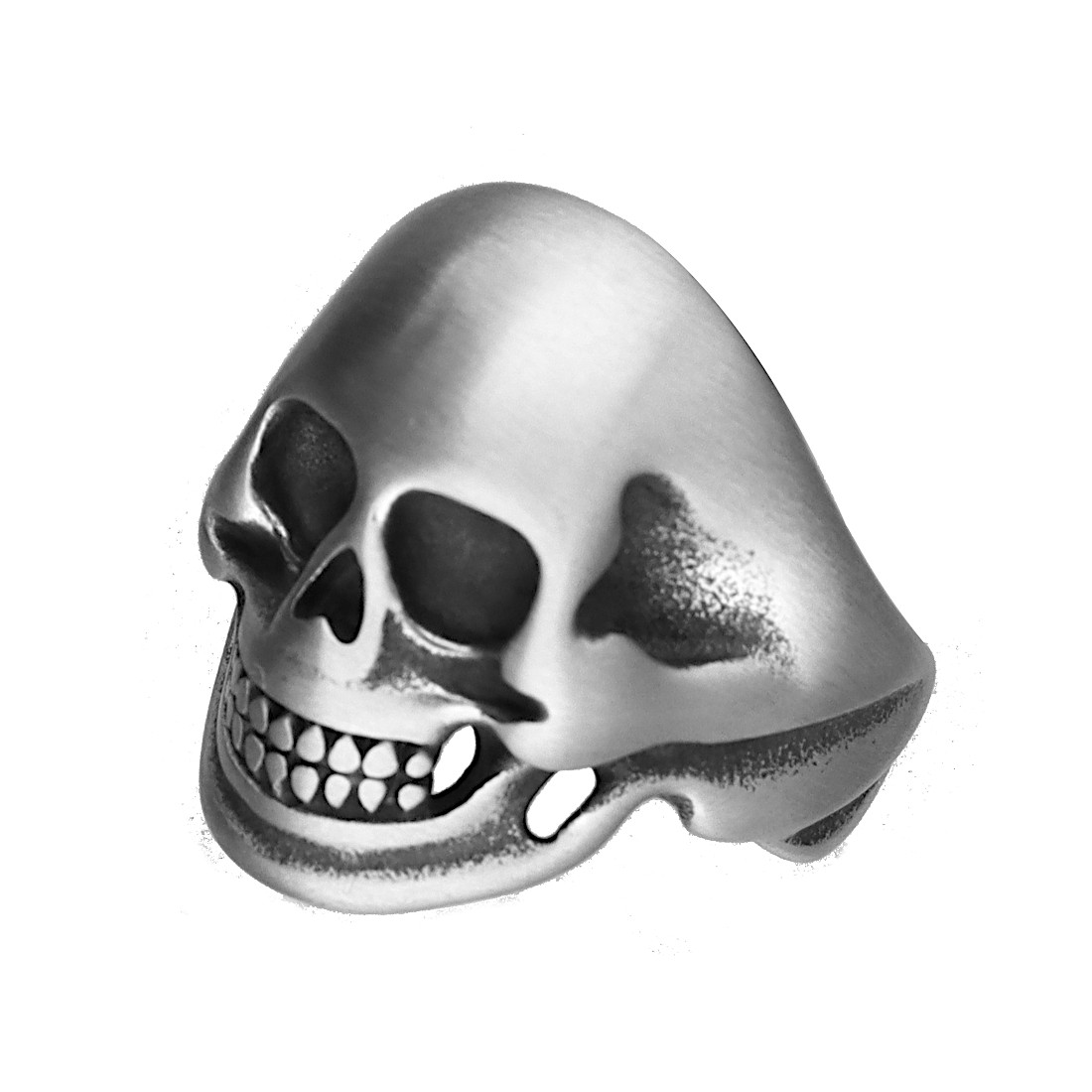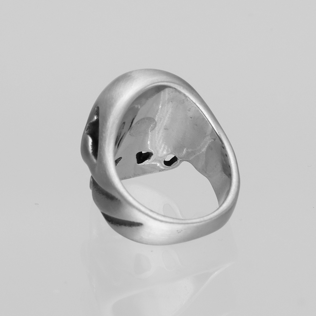 Pierścień ma formę sygnetu średniej wielkości z wyraźnie zarysowaną trójwymiarową czaszką. Czaszka, główny motyw ozdobny, zajmujący centralną część pierścienia jest wykonana z dużą precyzją w odwzorowaniu anatomicznych elementów, takich jak głęboko wyżłobione oczodoły, nos, szczęka i zęby.