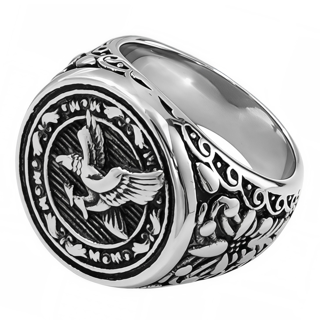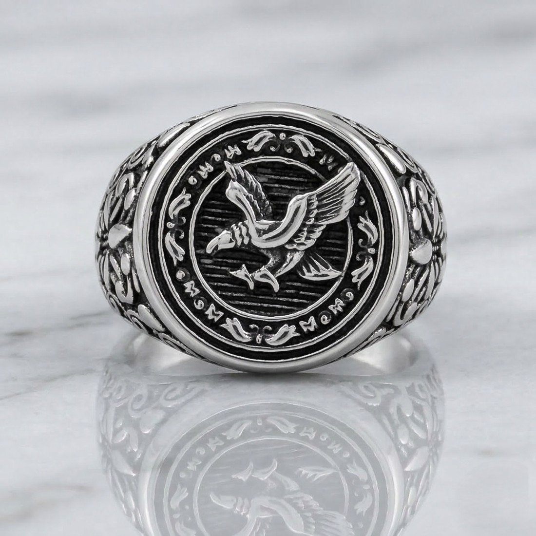 Sygnet ze stali szlachetnej z motywem orła i ornamentem roślinnym wykonany ze stali szlachetnej, znanej ze swojej wysokiej trwałości oraz odporności na czynniki zewnętrzne. Materiał ten nie koroduje, nie ciemnieje w kontakcie z wodą i jest odporny na zarysowania, co gwarantuje zachowanie pierwotnego wyglądu przez wiele lat. Stal szlachetna jest metalem hipoalergicznym, dzięki czemu produkt może być bezpiecznie noszony przez osoby o wrażliwej skórze, nie powodując reakcji alergicznych ani przebarwień na palcu.