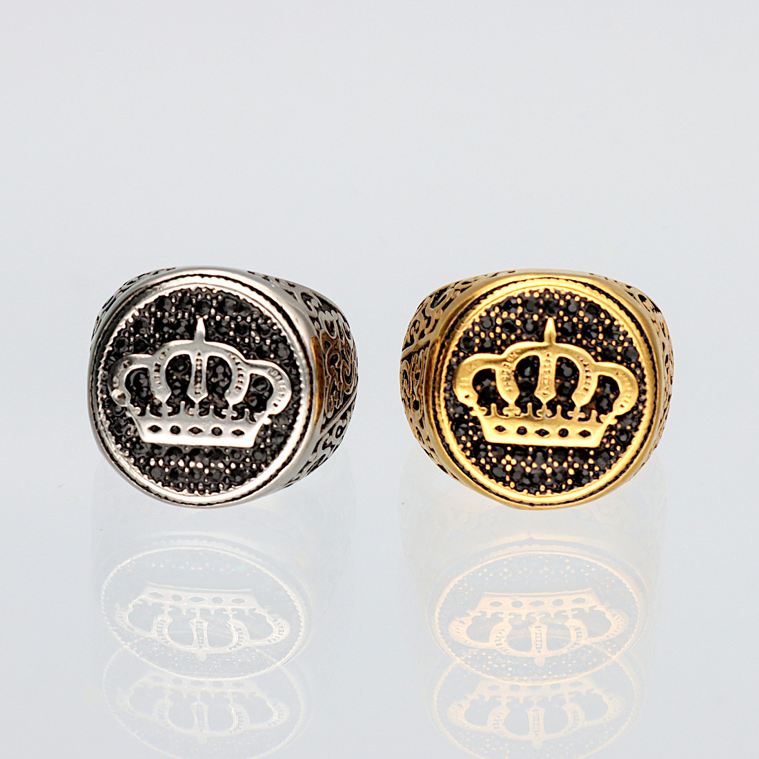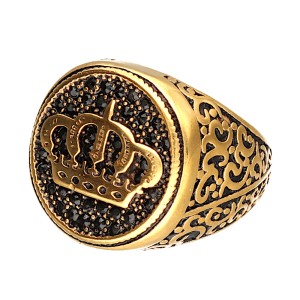 Główną część sygnetu zajmuje okrągła tarcza z wypukłą koroną, otoczoną małymi, czarnymi cyrkoniami. Błyszczące kamyczki i polerowana powierzchnia sygnetu dodają mu elegancji i luksusowego wyglądu. Po bokach znajdują się ozdobne, wyżłobione wzory, które przypominają ornamenty roślinne lub arabeski. Nadaje to sygnetowi unikatowego wyglądu vintage.