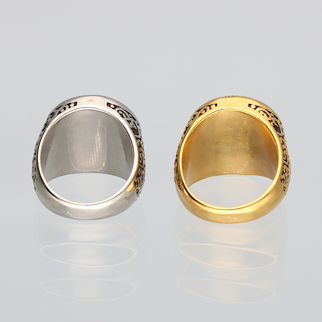 Ozdobny złoty pierścień w klasycznej formie okrągłego sygnetu z oksydowanej Stali Chirurgicznej 316L, materiału przyjaznego dla skóry, trwałego, odpornego na korozję. Kolorowa powłoka PVD (Physical Vapour Deposition) zapewnia odporność na ścieranie i uszkodzenia mechaniczne.