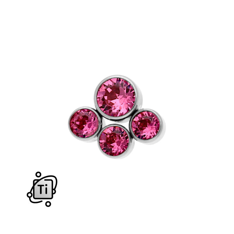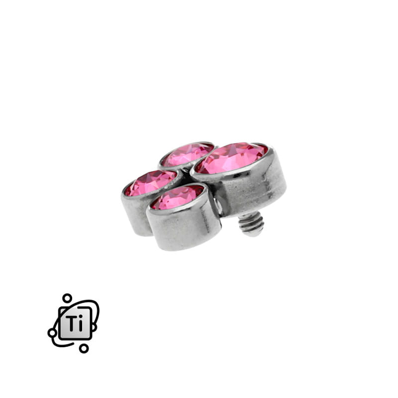 Efektowna nakrętka do mikrodermali, wykonana z różowych cyrkonii i Tytanu G23, biokompatybilnego, hipoalergicznego i odpornego na korozję materiału, idealnego do implantów skórnych. Top ma formę konstrukcji z czterech połączonych ze sobą okrągłych elementów: jednego większego i trzech mniejszych. W każdym z elementów zakuta jest okrągła, szlifowana cyrkonia.